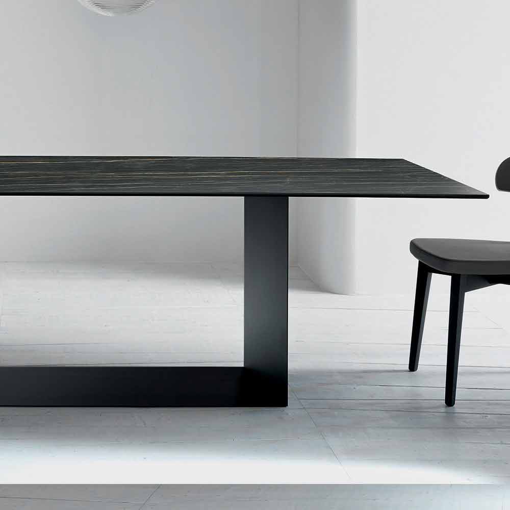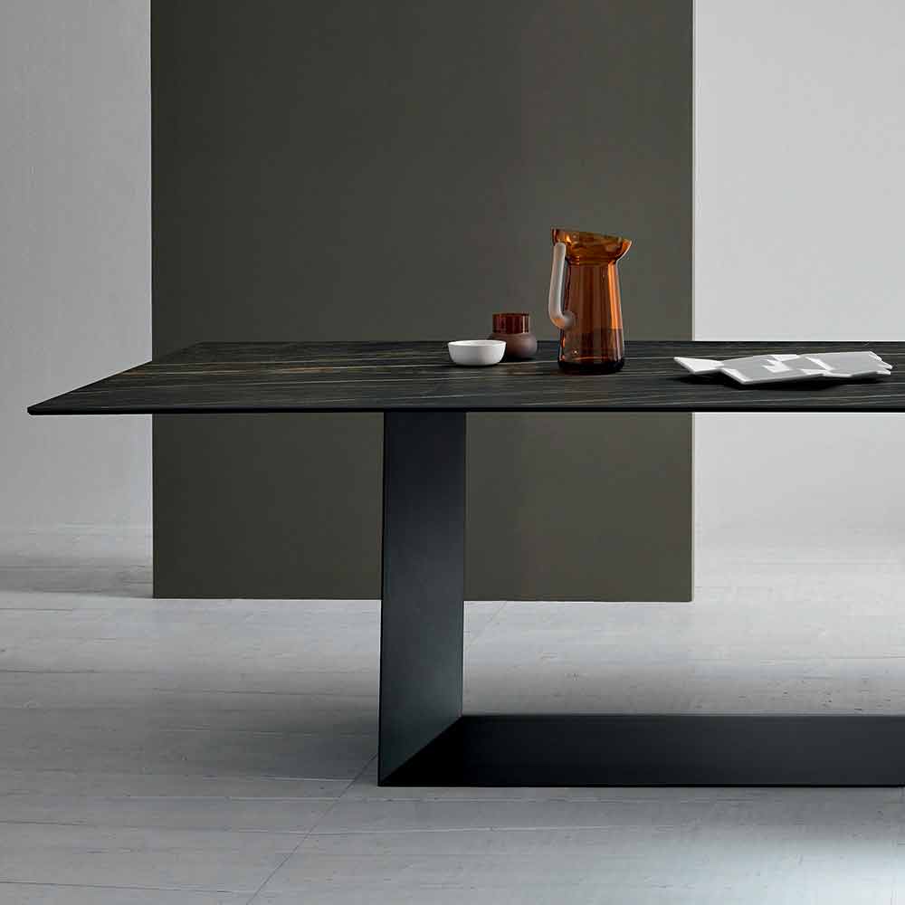 Masă living design din ceramică Noir Desir mată și bază din grafit mat negru sau metal vopsit din bronz periat, fabricat în Italia.