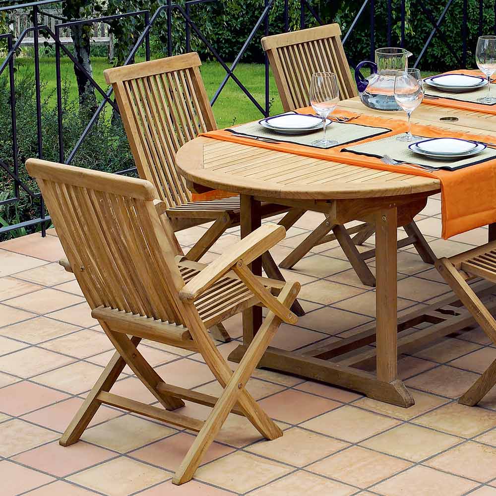 Masă de grădină extensibilă din lemn de tec cu scaune și fotolii.