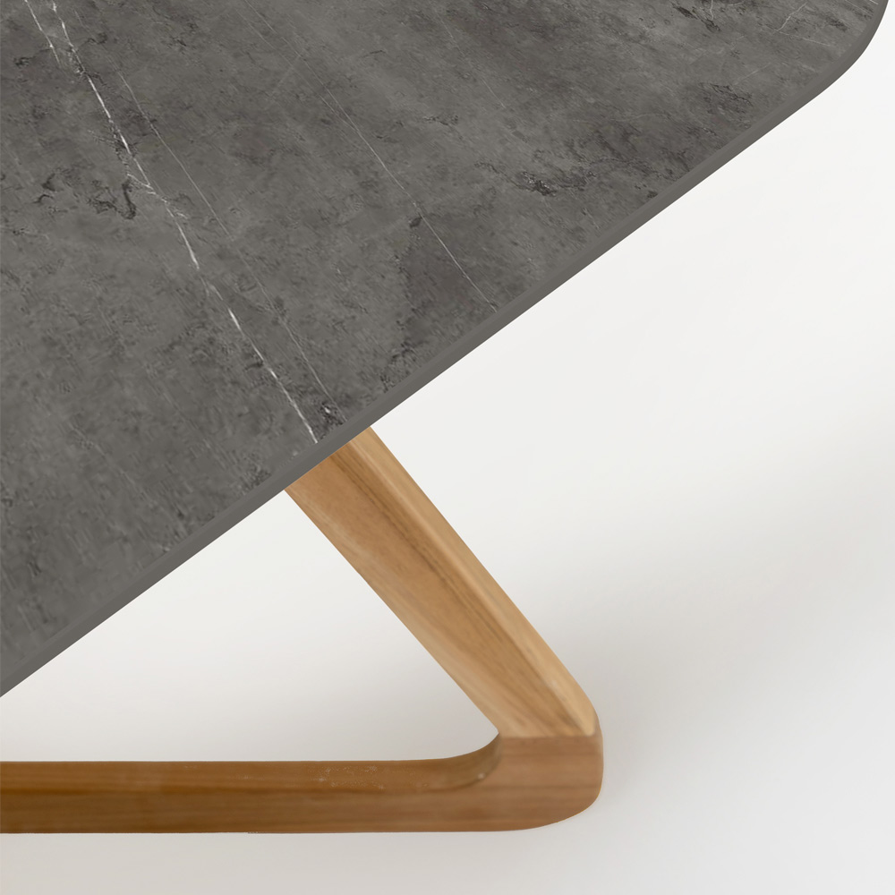 fabricată în întregime în Italia. Această masă de exterior cu blat ceramic Pietra Grey este o alegere excelentă pentru cei care caută un design simplu, dar cu impact. Această masă combină o bază robustă din lemn cu un blat ceramic care imită perfect eleganța pietrei gri, cu venături albe subtile care adaugă profunzime și caracter designului general.