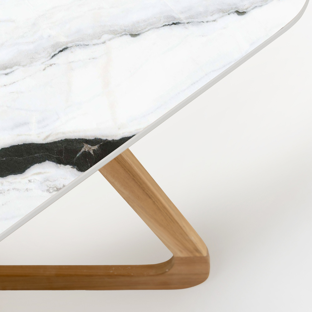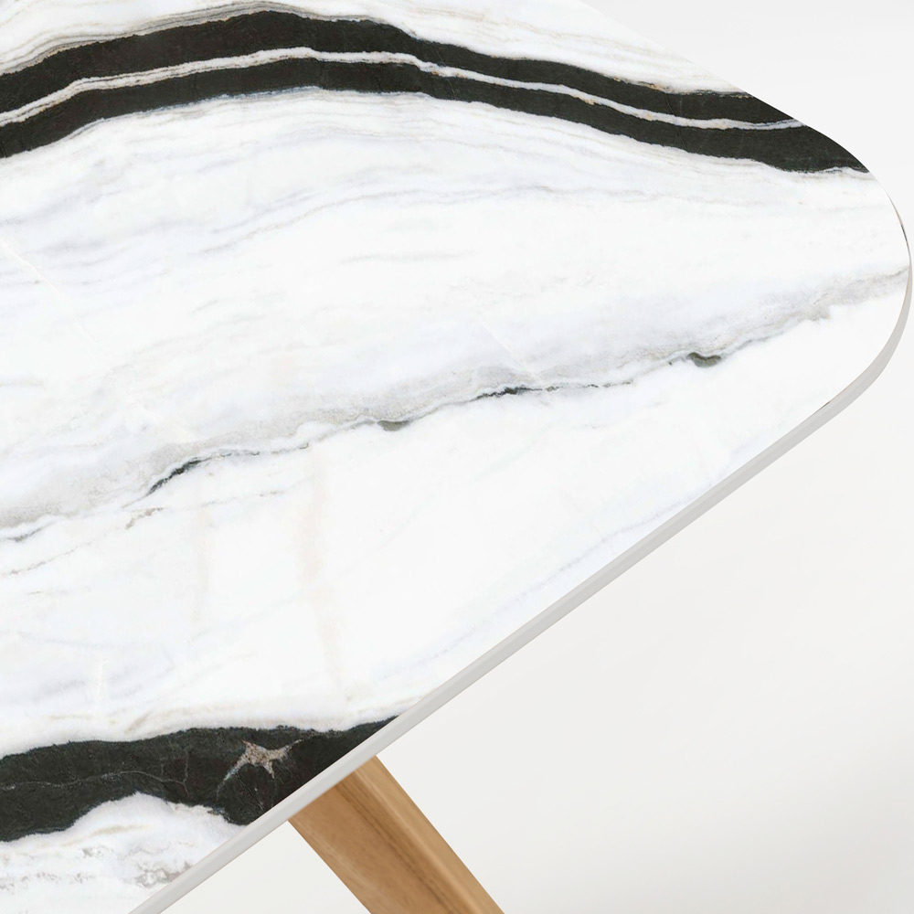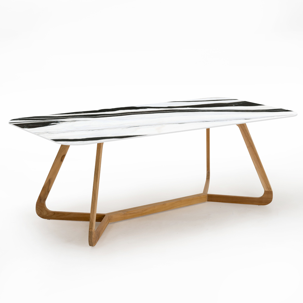 fabricată în întregime în Italia. Această masă de exterior este o adevărată capodoperă a designului, combinând căldura lemnului cu eleganta puritate a ceramicii Panda White . Acest blat impresionant, cu fibre negre îndrăznețe pe un fundal alb pur, nu este doar atrăgător din punct de vedere vizual, ci și incredibil de durabil și ușor de întreținut, perfect pentru orice decor exterior.