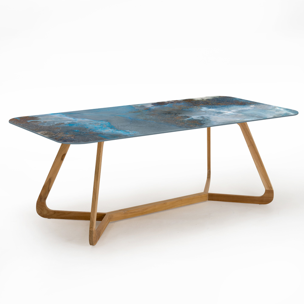 fabricată în întregime în Italia. Această masă de exterior este o fuziune perfectă între eleganța naturală și arta modernă. Blatul, realizat din ceramică de înaltă calitate, prezintă un finisaj unic care imită texturile organice și culorile vibrante ale unei formațiuni stâncoase, cu nuanțe de albastru, gri și accente de cupru. Această suprafață nu este doar atrăgătoare, ci și extrem de durabilă, ideală pentru utilizarea zilnică în aer liber.