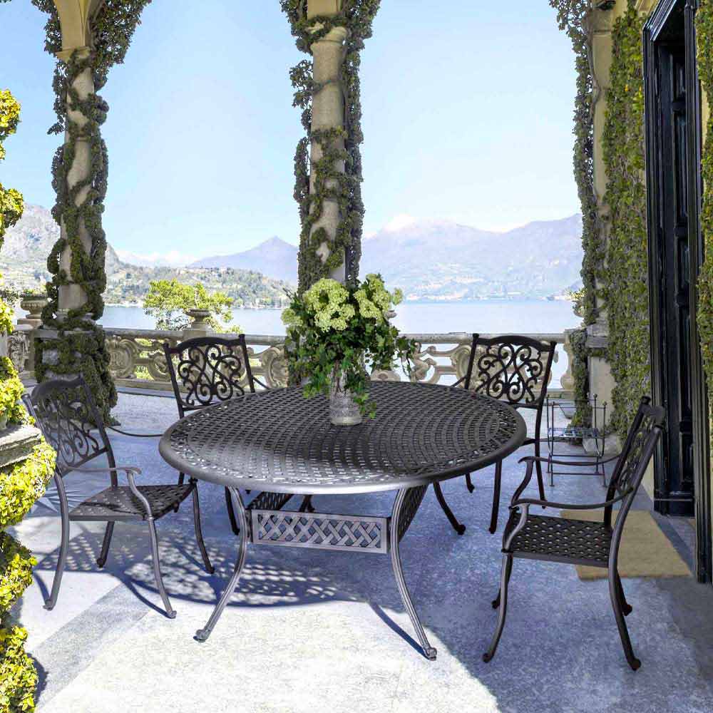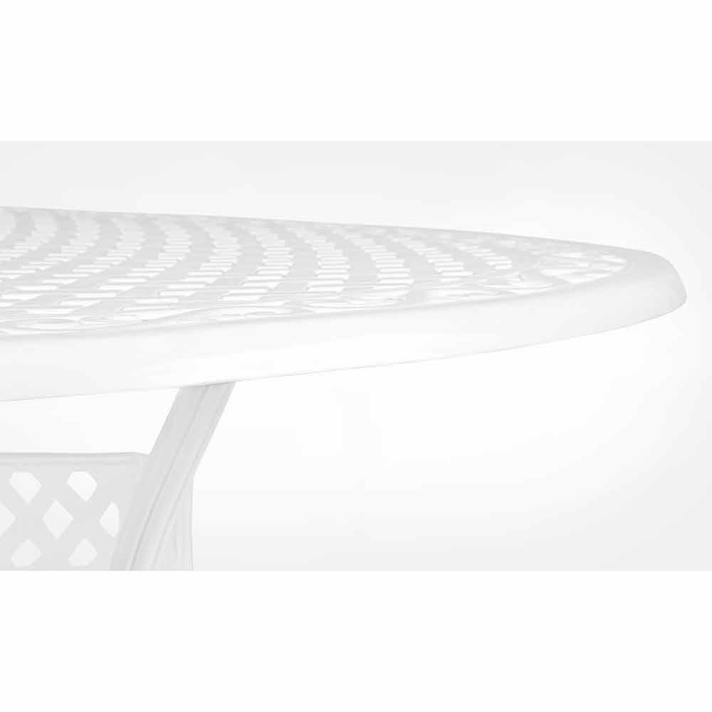 Masă de exterior în aluminiu vopsit cu efect lucios.