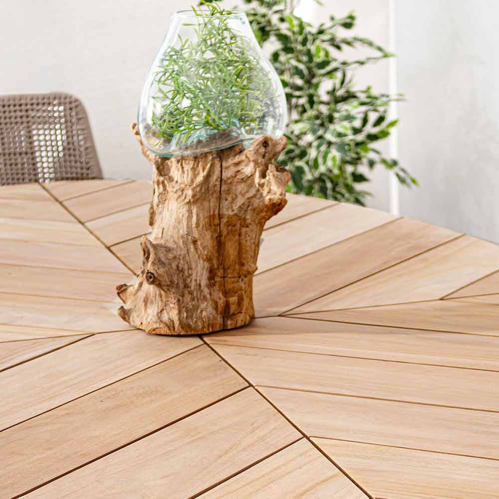 Blat din lemn de tec (clasa A) - SVLK (lemn certificat din păduri durabile), picioare din aluminiu acoperit cu pulbere (poliester). Ferramente din oțel zincat.