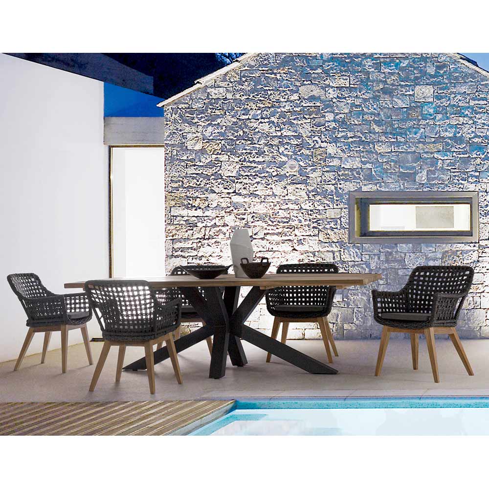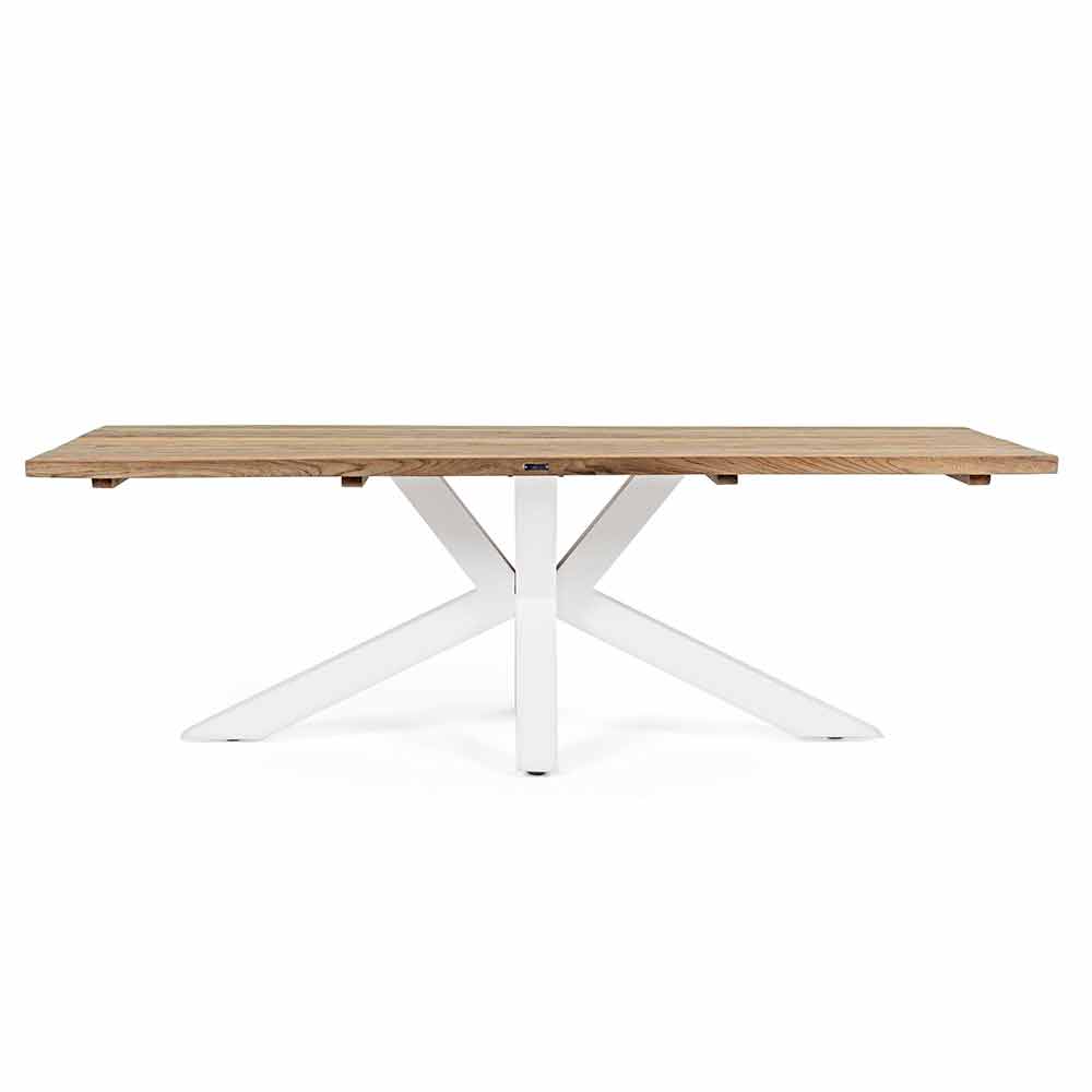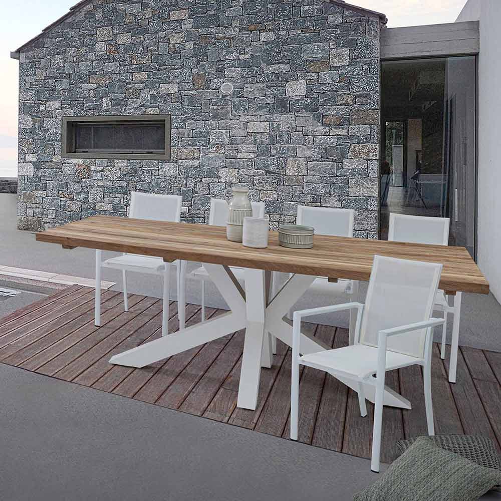 Masă modernă în aer liber, cu picioare din aluminiu alb sau negru și blat din lemn de tec, pentru 10 persoane.