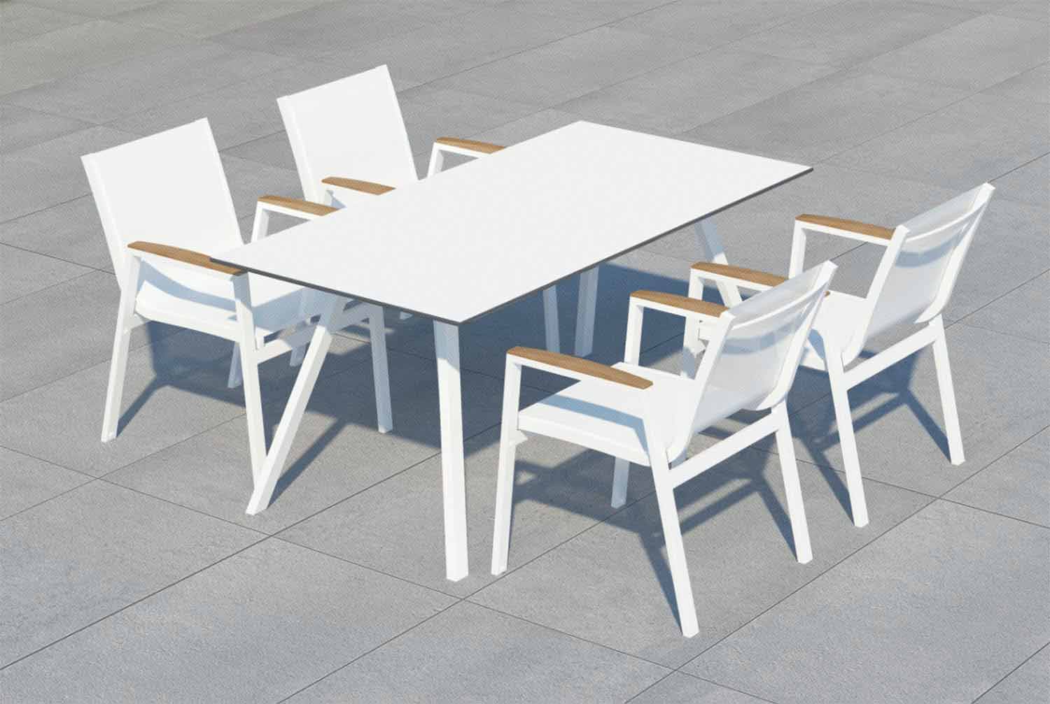 Masă de grădină cu design modern, structură din aluminiu și HPL laminat, disponibilă în diferite culori și dimensiuni.