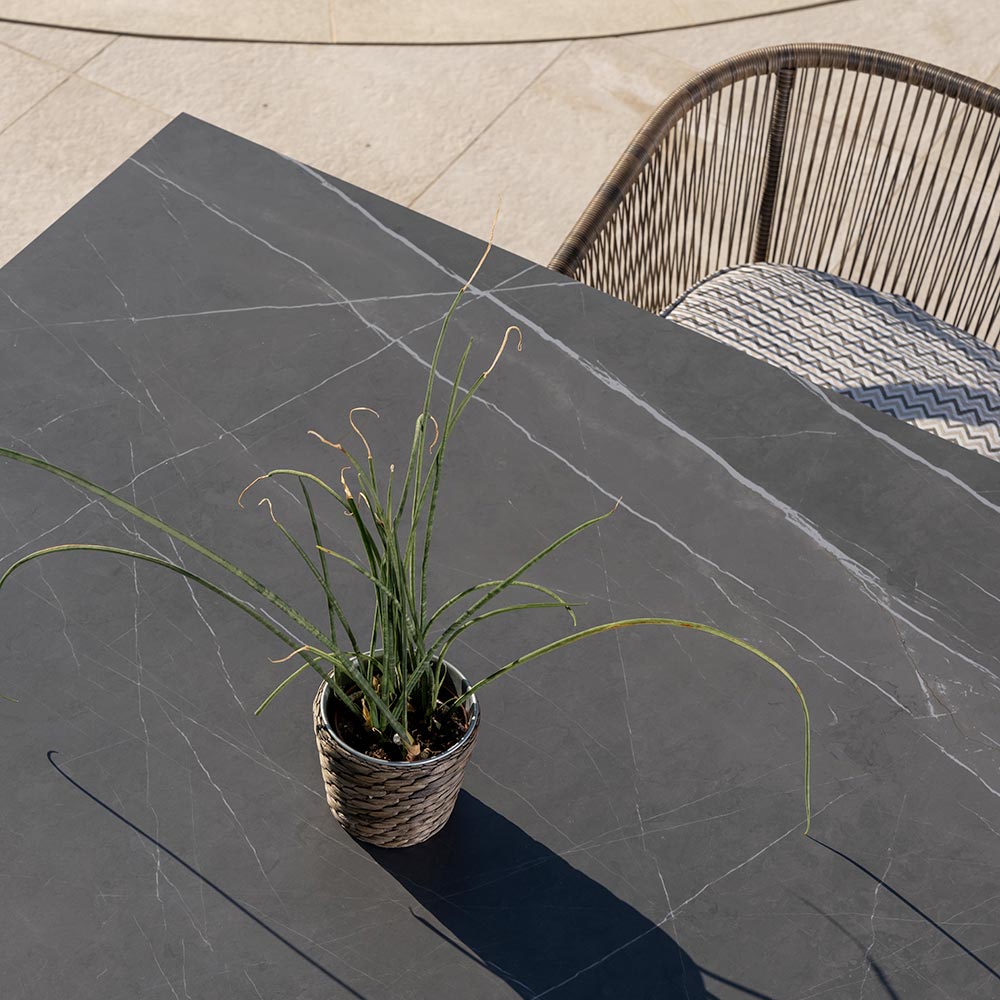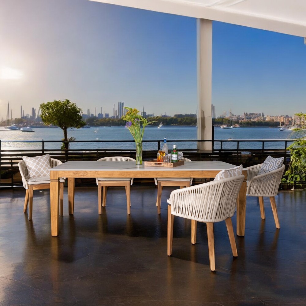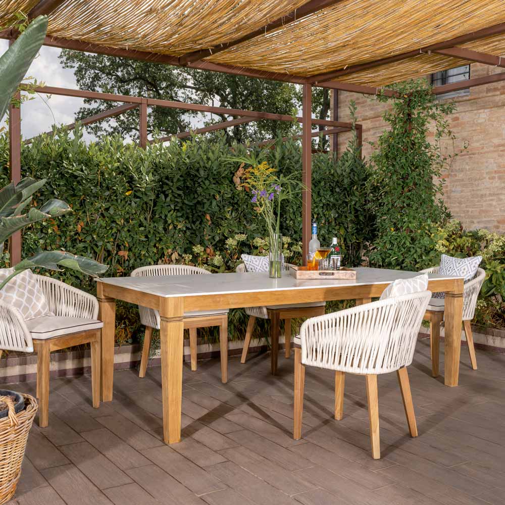 Mesă de exterior din lemn de tec natural și blat ceramic.
