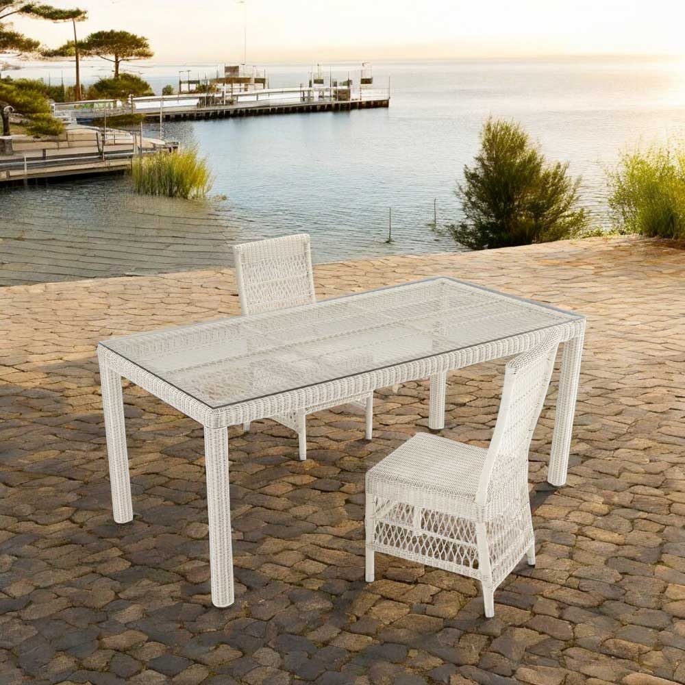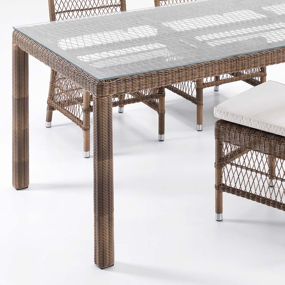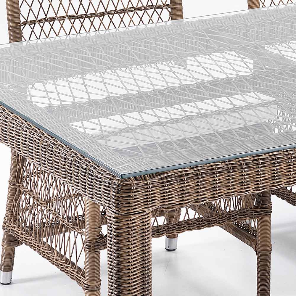 top din sticlă, 4 scaune și 2 fotolii cu brațe cu cadru din aluminiu și împletitură Polyrattan marca REHAU. Această compoziție se caracterizează prin designul său puternic