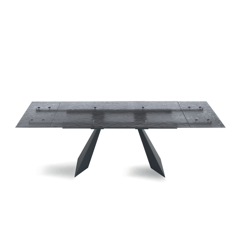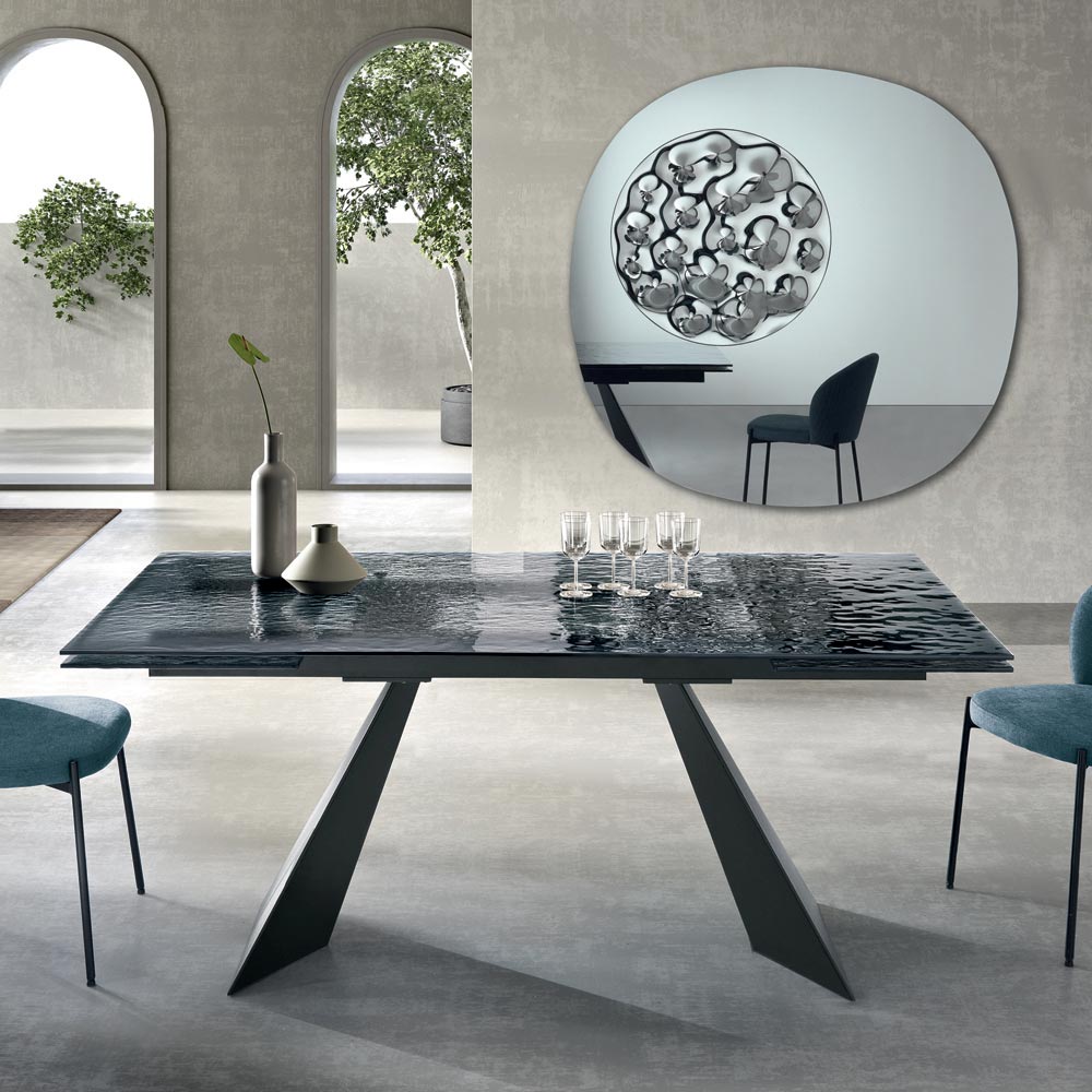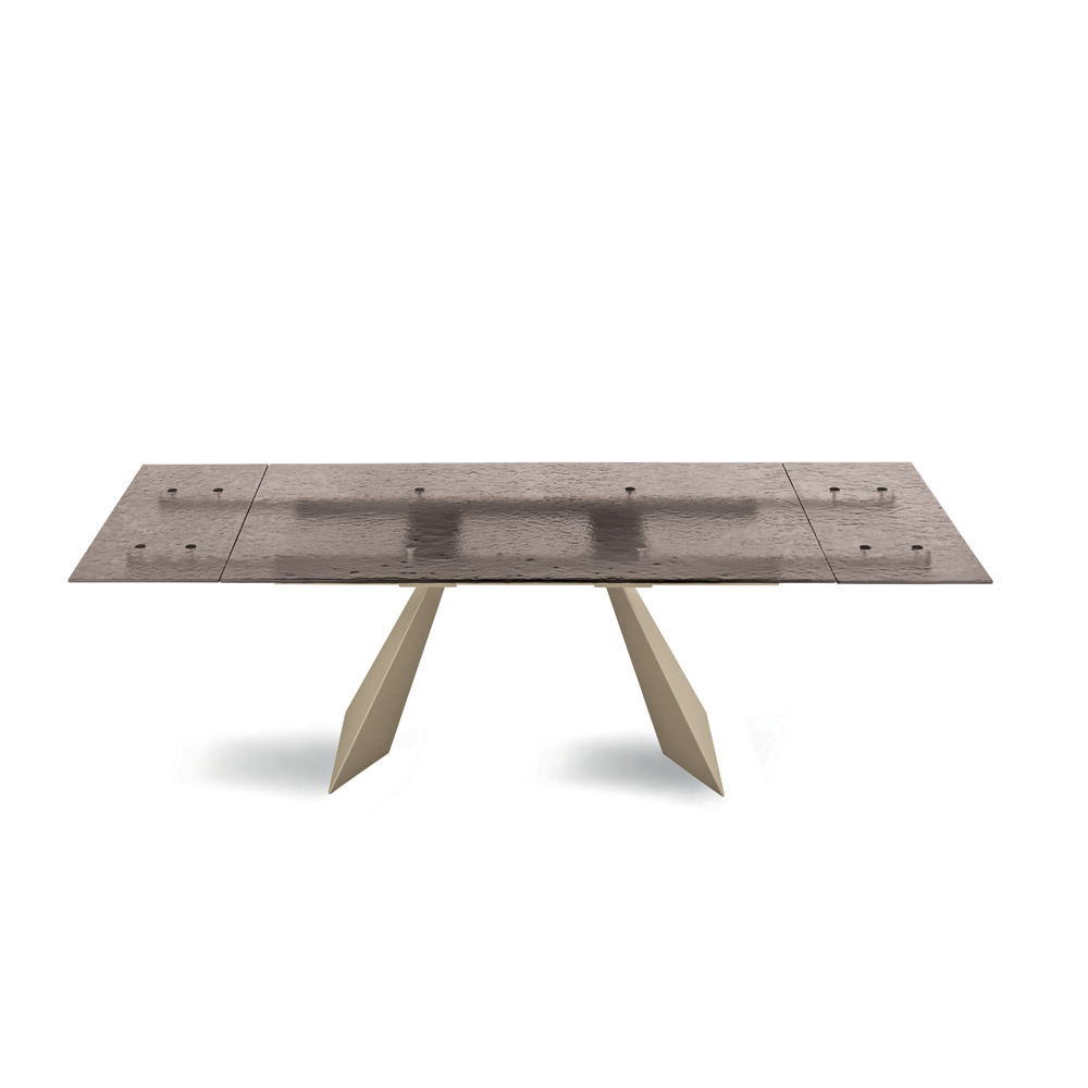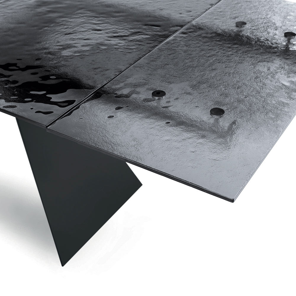 Această masă de dining reprezintă o interpretare inovatoare a designului modern, combinând materiale de înaltă calitate și o formă sculpturală care captează privirea. Blatul, realizat din sticlă ciocănită , este o adevărată operă de artă: fiecare detaliu al suprafeței sale reflectă lumina într-un mod unic, creând un joc de reflexii și transparențe care adaugă profunzime și interes vizual spațiului.