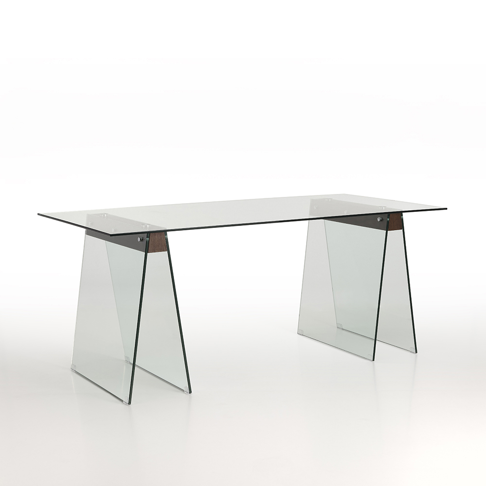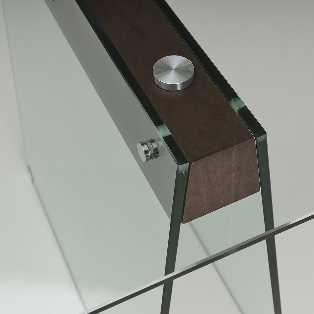 Losanna este o masă în stil modern, cu picioare din sticlă transparentă și un blat din sticlă transparentă cu grosimea de 12 mm și inserții din MDF de culoarea nucului.