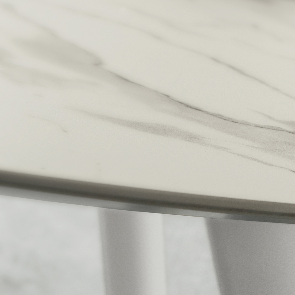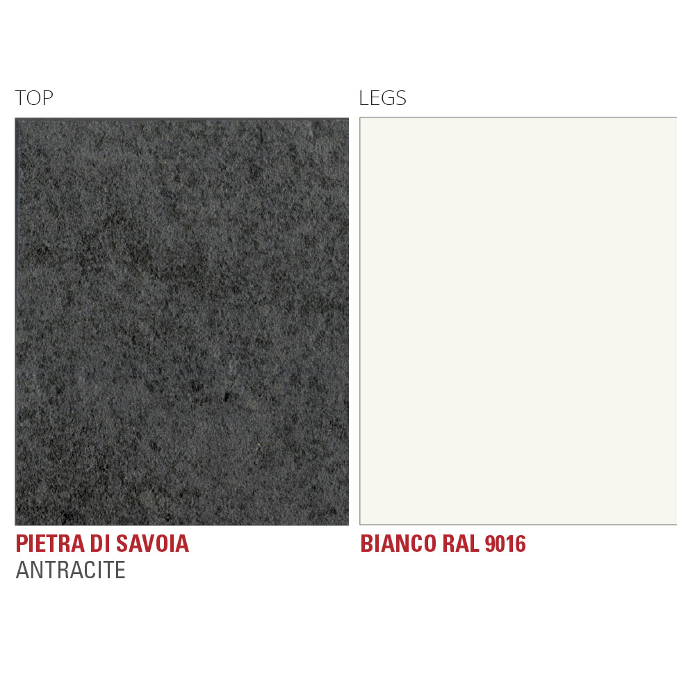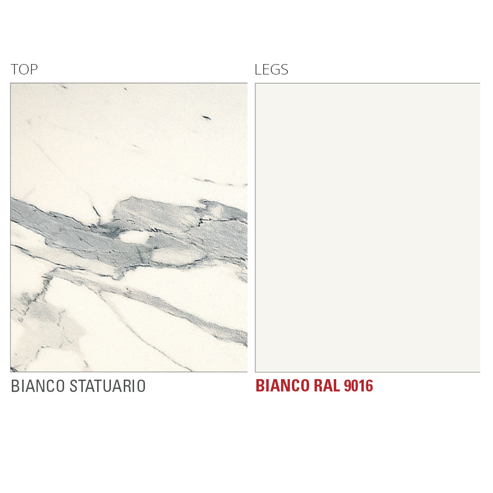 din aluminiu lacuit cu pudra epoxidica in finisaj alb. Din întâlnirea dintre eleganța atemporală a efectului de marmură și a efectului de piatră și atingerea modernă a aluminiului ia naștere o piesă de mobilier cu