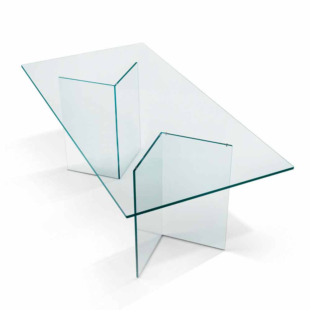 Această masă dreptunghiulară este realizată în întregime din sticlă extra-clară, cu o structură compusă din două suporturi de sticlă care pot fi aranjate paralel sau specular în funcție de utilizare.
