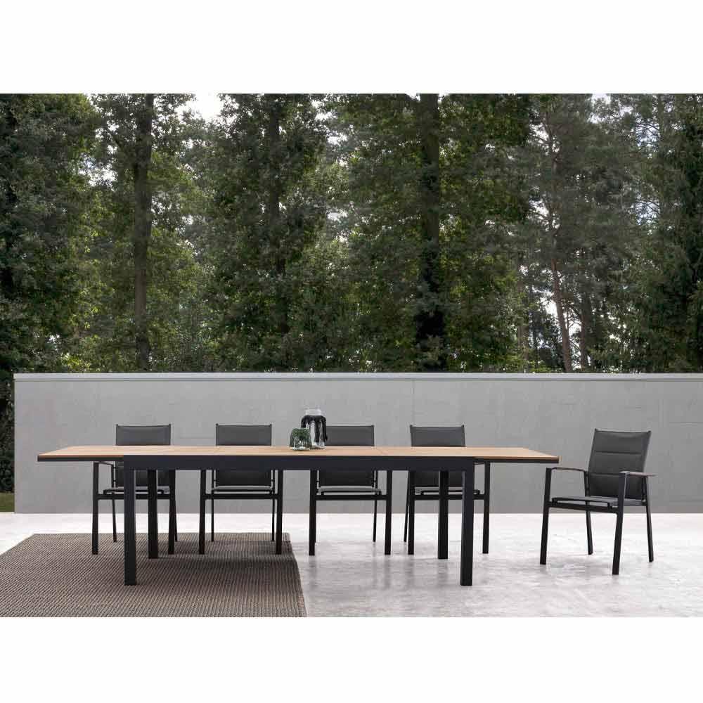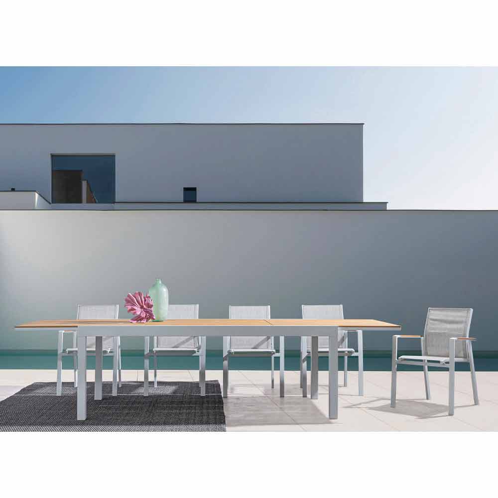 Masă de luat masa în aer liber, cu blat extensibil din poliester.