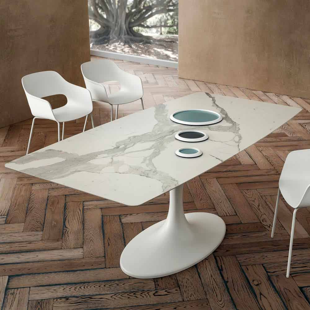 Masa de bucatarie cu blat din butoi laminat si baza din marmura Made in Italy, de inalta calitate.