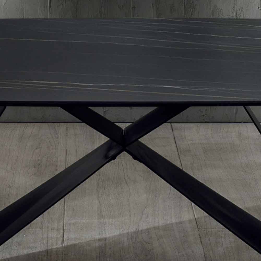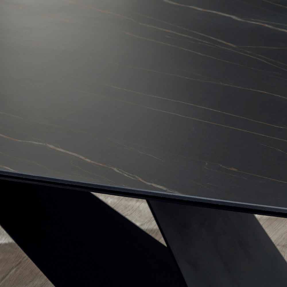 Această masă de luat masa este un produs cu un puternic impact vizual capabil să cucerească centrul scenei cu o mare eleganță. Structura sa este realizată din metal mat vopsit antracit , în timp ce partea superioară este alcătuită dintr-un strat superior de ceramică pură cu efect portoro de 6 mm grosime sub care se aplică un strat de sticlă gros de 8 mm care conferă flexibilității ceramice permițând astfel evitarea deteriorării . Mai mult, datorită dimensiunilor sale mari, masa poate găzdui până la 10 persoane , făcând astfel posibilă prânzul și cina cu prietenii. Ceea ce distinge acest articol este, fără îndoială, designul particular al bazei care, datorită jocurilor geometrice create de plăcile metalice, conferă mișcare și caracter mesei. Combinația dintre materialele și finisajele selectate permite obținerea unui produs final cu un design extrem de modern, ideal pentru mobilarea încăperilor cu un gust sofisticat și elegant .