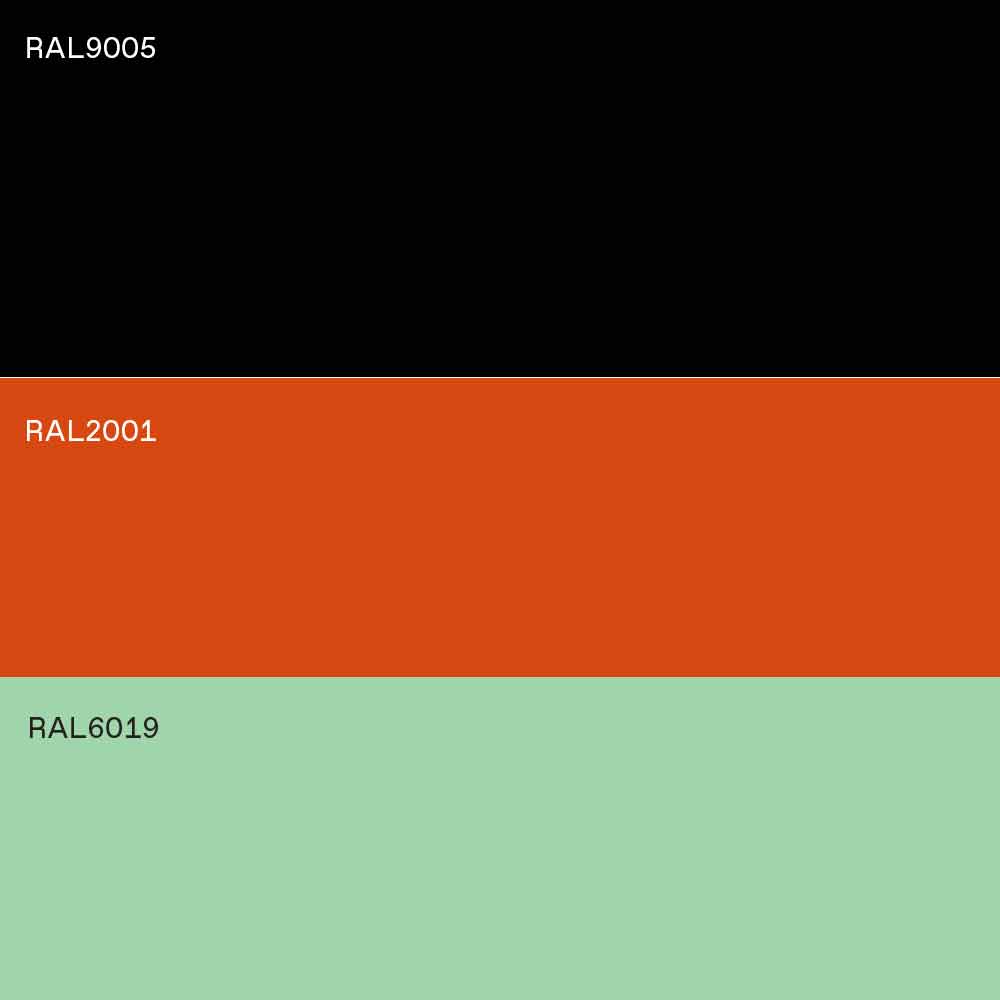 Finisaj: picioare în portocaliu RAL2001 + cruce verde aqua RAL6019 + blat rezistent la zgârieturi în negru RAL9005