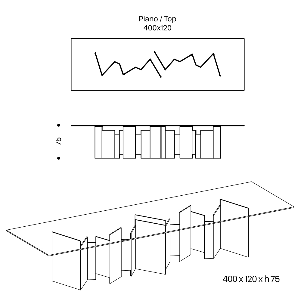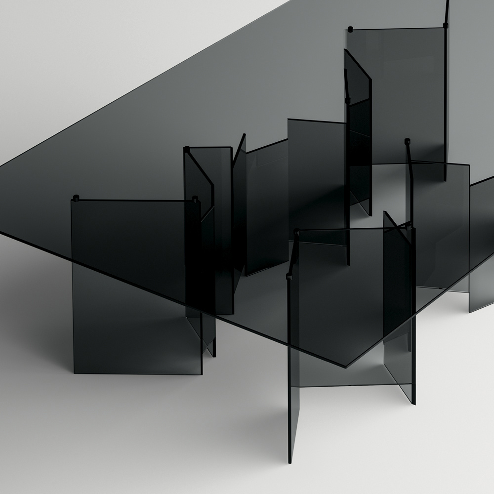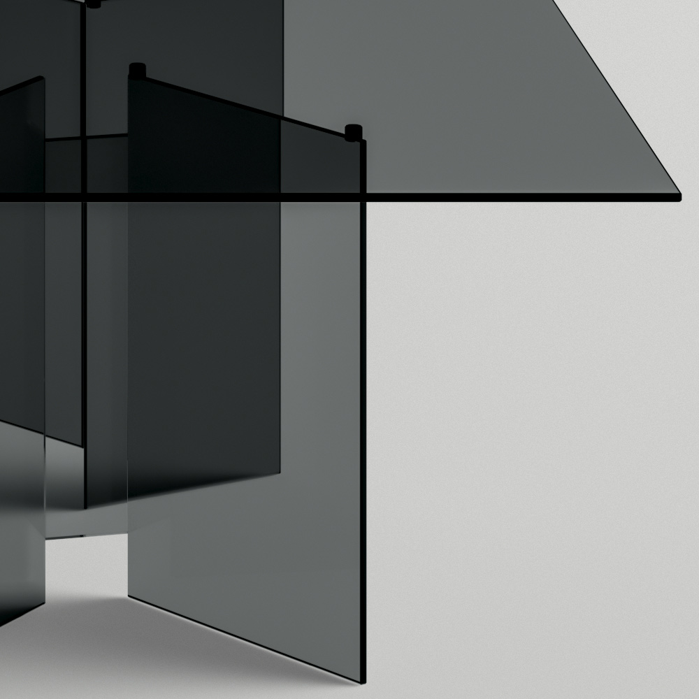 Alegerea de a folosi un material simplu precum sticla dar in acelasi timp cu un puternic impact vizual caracterizeaza intreaga estetica a produsului facandu-l original , contemporan si elegant , ideal pentru cei care cauta o solutie de amenajare capabila sa completeze zona de living de casa cu personalitate moderna si impunatoare . Din punct de vedere vizual, ceea ce frapează este, fără îndoială, forma particulară a bazei care este alcătuită din numeroase plăci de sticlă îmbinate asimetric pentru a oferi mesei un sentiment de dinamism împreună cu o atingere exclusivă și rafinată .