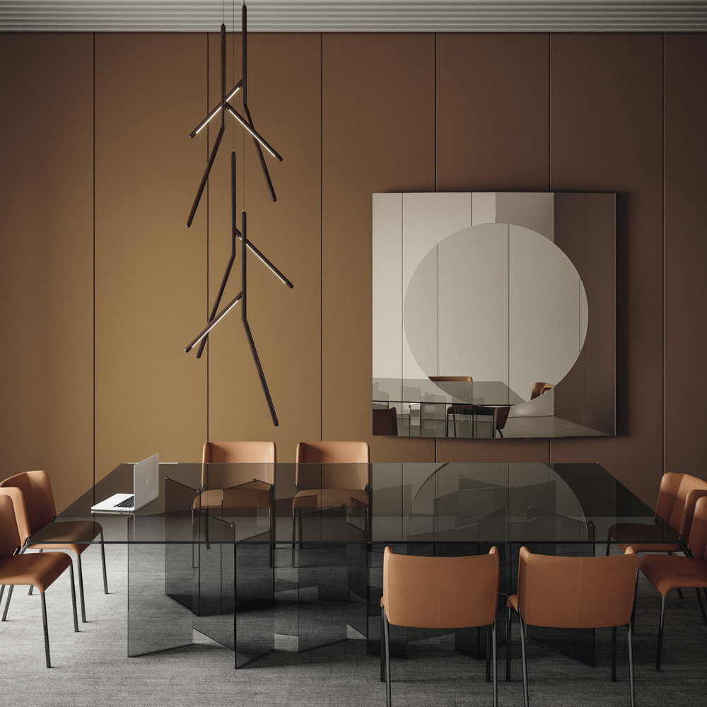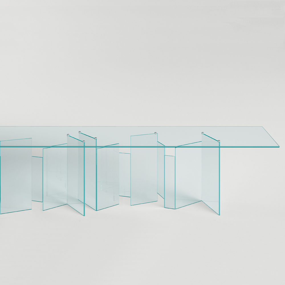 Masa de sufragerie compusa dintr-o baza cu forme geometrice si un blat dreptunghiular ambele din sticla . O soluție de amenajare care provine dintr-un proces de producție Made in Italy prin prelucrarea expertă a sticlei de către meșteri pricepuți care permit să dea viață combinației perfecte de calitate , design și funcționalitate .