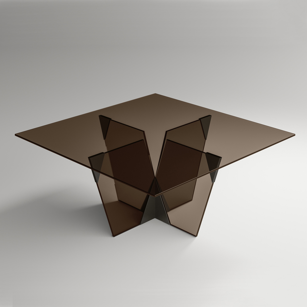 structură elegantă și sculpturală care provine din combinarea materialelor de natură diferită împreună cu pasiunea pentru prelucrarea sticlei, reușind astfel să definească o reprezentare a forței și a caracterului prin diferite forme și grosimi. Punctul forte al esteticii sale este baza arhitecturala caracterizata printr-o imbinare piramidala din metal care constituie partea esentiala a produsului. Elementele metalice completează designul mesei dând formă sticlei bazei și îmbogățindu-l cu personalitate și originalitate.