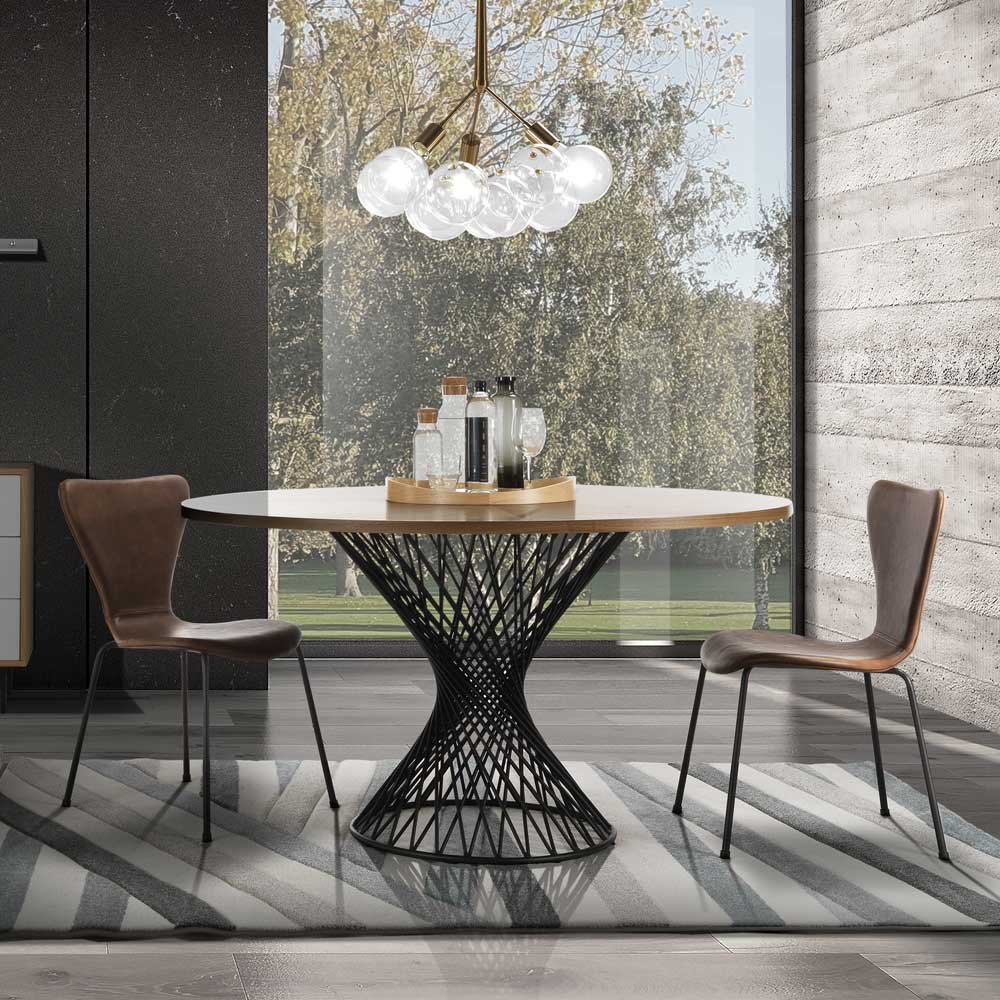 Masa de sufragerie cu blat rotund din mdf furniruit cu finisaj stejar si baza din metal vopsit negru mat . O piesă de mobilier cu stil rustic, caracterizată prin forma particulară a structurii care conferă produsului un sentiment de dinamism datorită formei spiralate. Datorită dimensiunilor reduse, va fi posibil să amenajați și săli de mese sau bucătării cu spații limitate cu personalitate, fără a fi nevoie să renunțați la un plus de caracter și inovație .