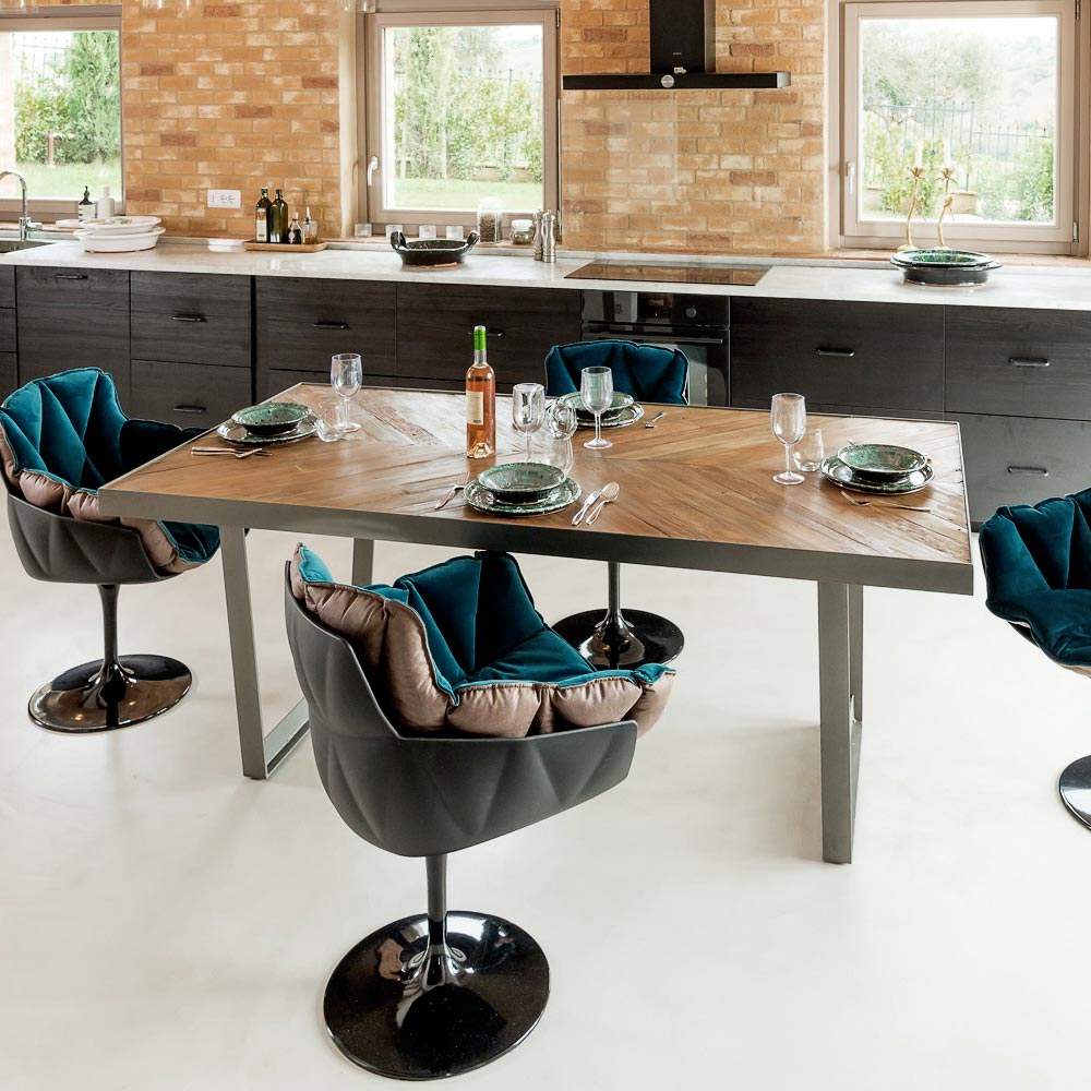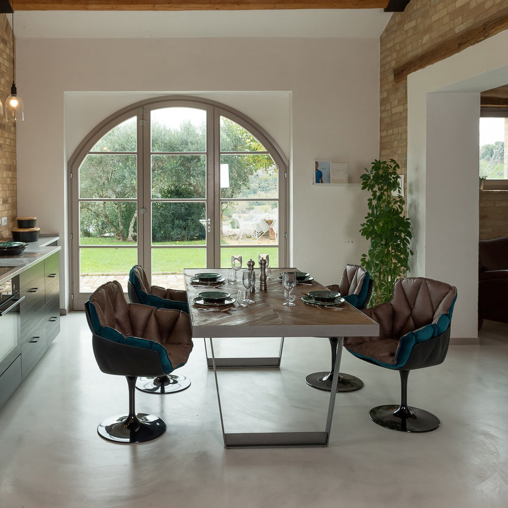 Acest set de mobilier este literalmente unic tocmai pentru că întruchipează istoria particulară a materiei trăite. Prelucrarea are loc în cea mai mare parte după procedee artizanale . Fiecare zgârietură și imperfecțiune, fiecare cicatrice de pe lemn, mărturisesc originalitatea unui trecut care capătă o nouă viață. Lemnul tropical reciclat legal din artefacte vechi, bărci și clădiri abandonate este tratat și periat cu experiență pentru a-și recâștiga demnitatea și strălucirea. Acest produs imbina esenta gustului rustic cu formele designului contemporan si cu cateva detalii ale stilului industrial .