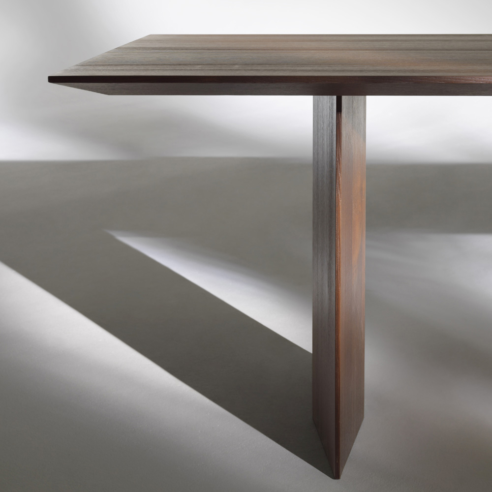 Această masă de sufragerie de design se remarcă prin estetica sa esențială și riguroasă, caracterizată de linii curate și proporții echilibrate. Blatul lat și subțire apare suspendat pe două picioare din panou, creând o compoziție solidă, dar vizual ușoară, ideală pentru spații contemporane și rafinate.