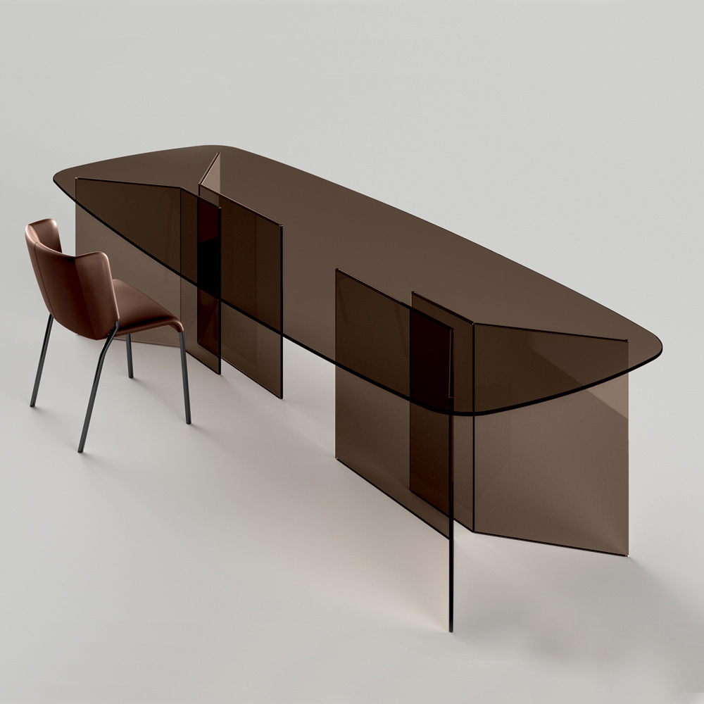 Masa de sufragerie in intregime din sticla ultrarezistenta cu blat dreptunghiular modelat. O completare cu un caracter rafinat care provine dintr-un proces de producție 100% Made in Italy, grație unor meșteri pricepuți, experți în prelucrarea sticlei, un singur material care dă viață unei mese de design prețioase.