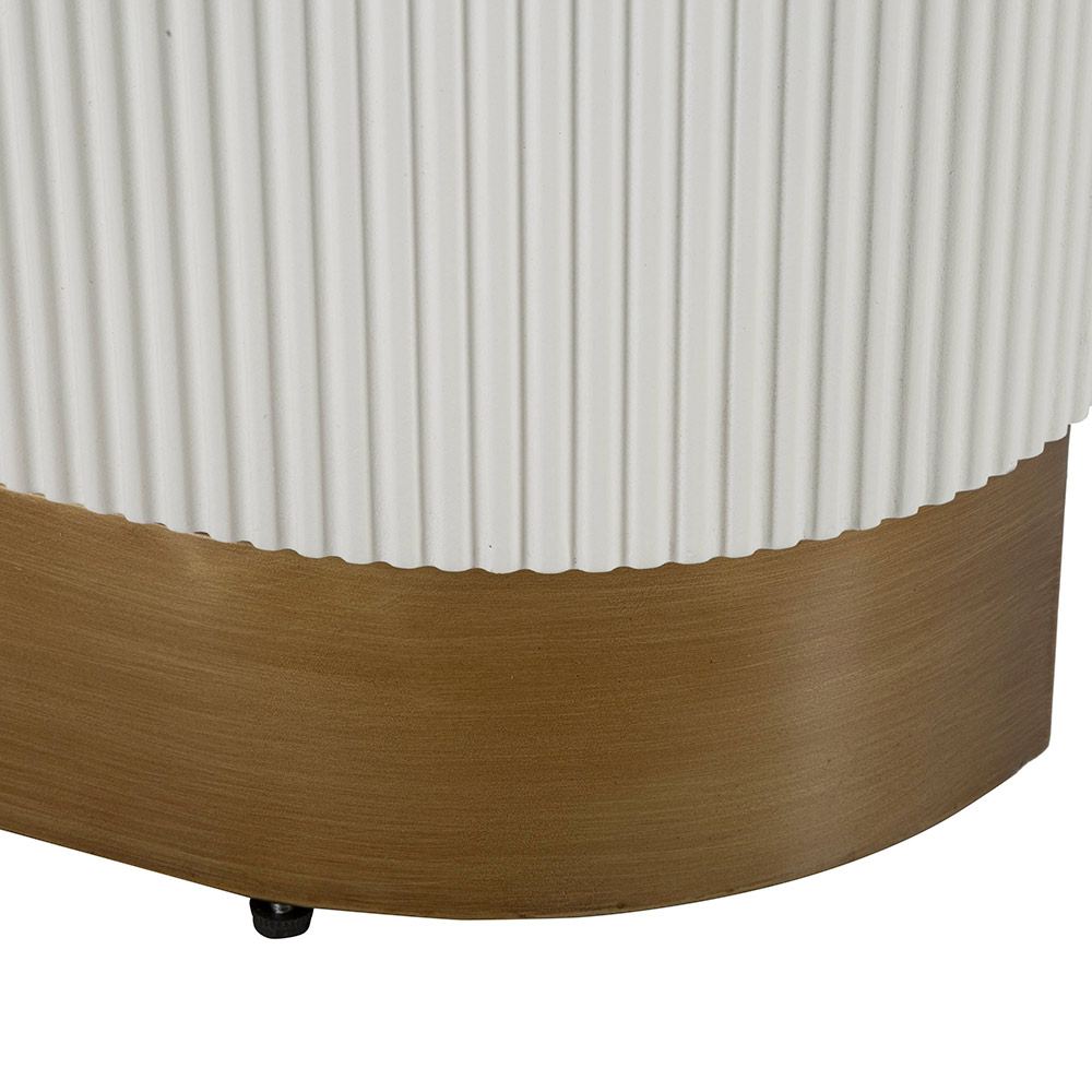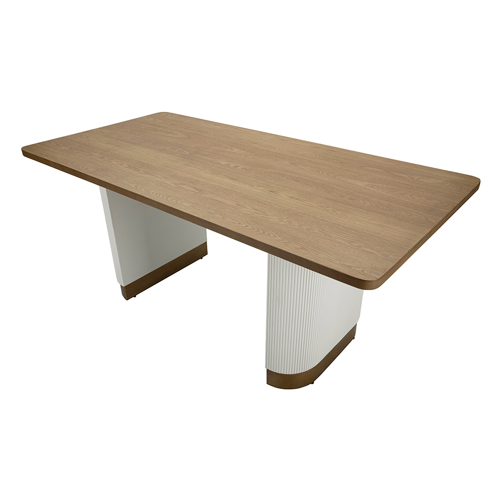 Această masă este o sinteză impecabilă de stil și funcționalitate , o piesă de mobilier concepută pentru a îmbogăți orice mediu cu prezența sa discretă, dar distinctă. Suprafata MDF, cu tonuri naturale calde, contrasteaza armonios cu baza alba cu caneluri verticale, oferind o textura vizuala rafinata si un design inspirat din elementele arhitecturii clasice.