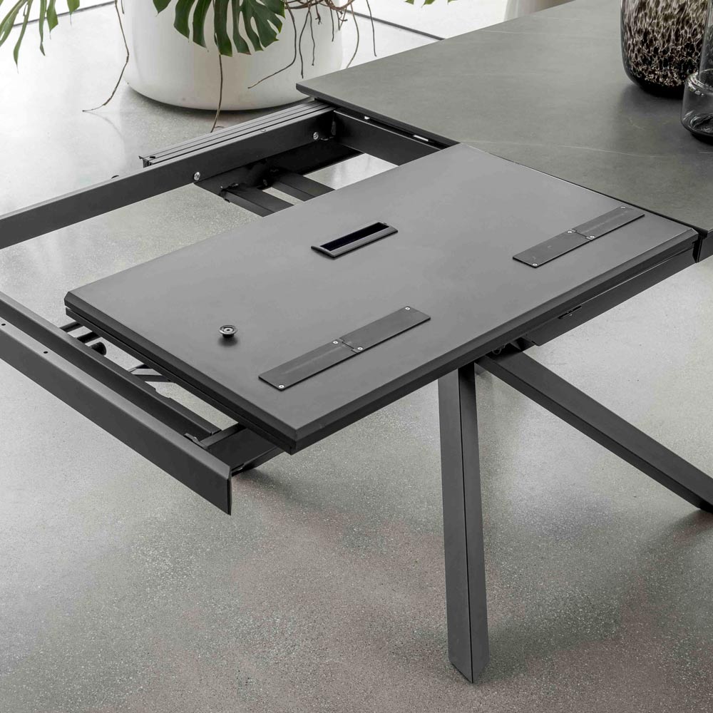 Blat din ceramică de piatră gri mat, extensie melaminată antracit și bază metalică cu finisaj grafit în relief