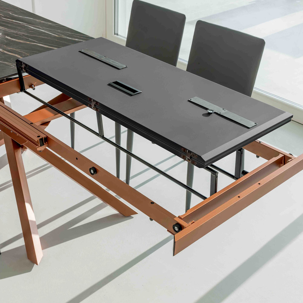 Adevărata frumusețe constă în flexibilitatea sa. Inchisa, este o masa sobra si eleganta ; deschis, se transforma intr-o suprafata generoasa de receptie . Ideal pentru cine cu prietenii, sesiuni colective de lucru sau ca spatiu versatil pentru familia ta, se adapteaza nevoilor momentului printr-o tranzitie fluida si fara efort.