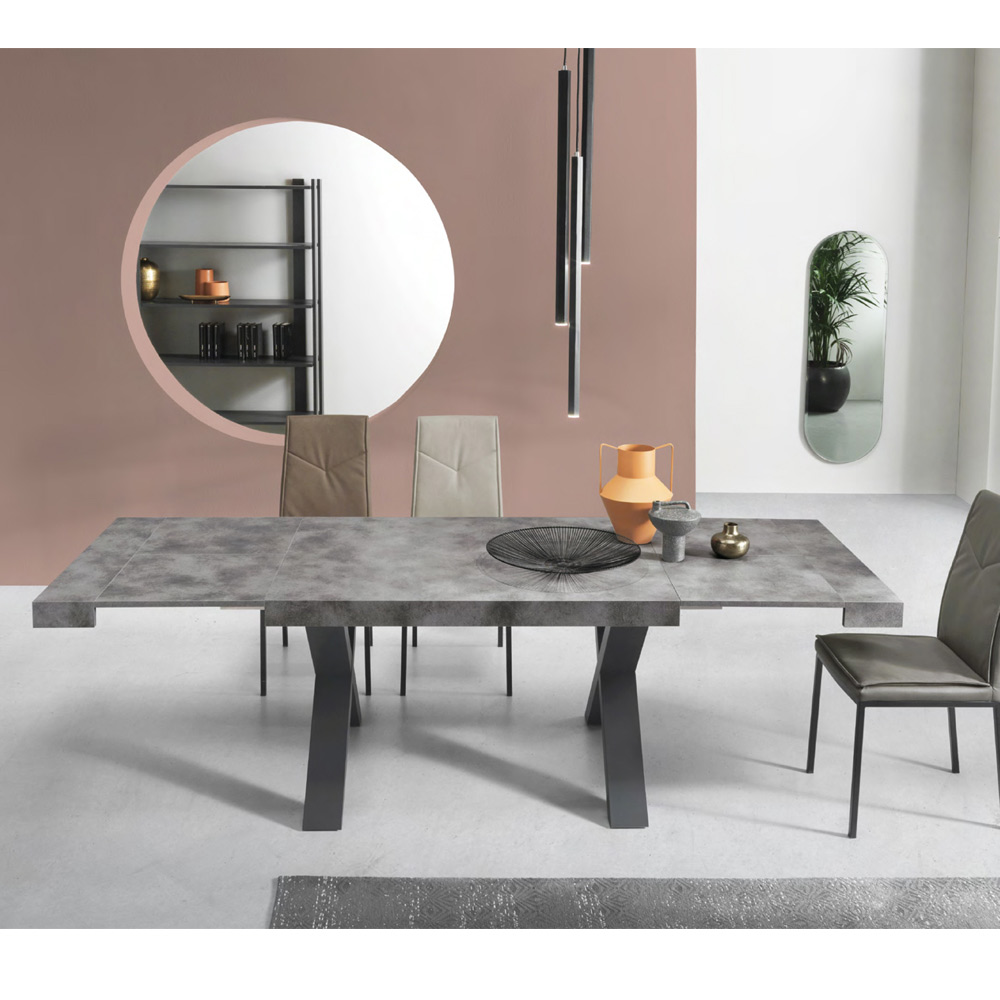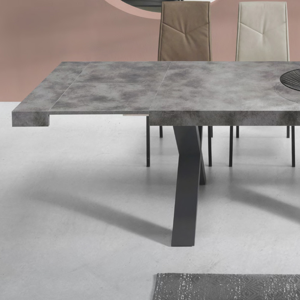 Masa de sufragerie cu blat si extensii din laminat cu efect de beton si structura in finisaj antracit. O piesă de mobilier realizată în întregime în Italia, concepută pentru a satisface cerințele celor care caută calitate , eleganță și funcționalitate într-un singur produs. Ceea ce este izbitor la estetica sa este forma particulară încrucișată a bazei, care oferă soliditate și robustețe produsului, precum și o notă de personalitate exclusivă designului său final. Blatul elegant cu efect de beton confera in schimb mesei un stil impunator capabil sa cucereasca rolul de protagonist in interiorul incaperii datorita si dimensiunilor sale mari.