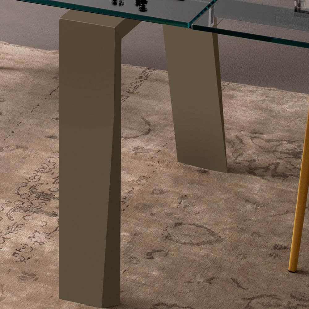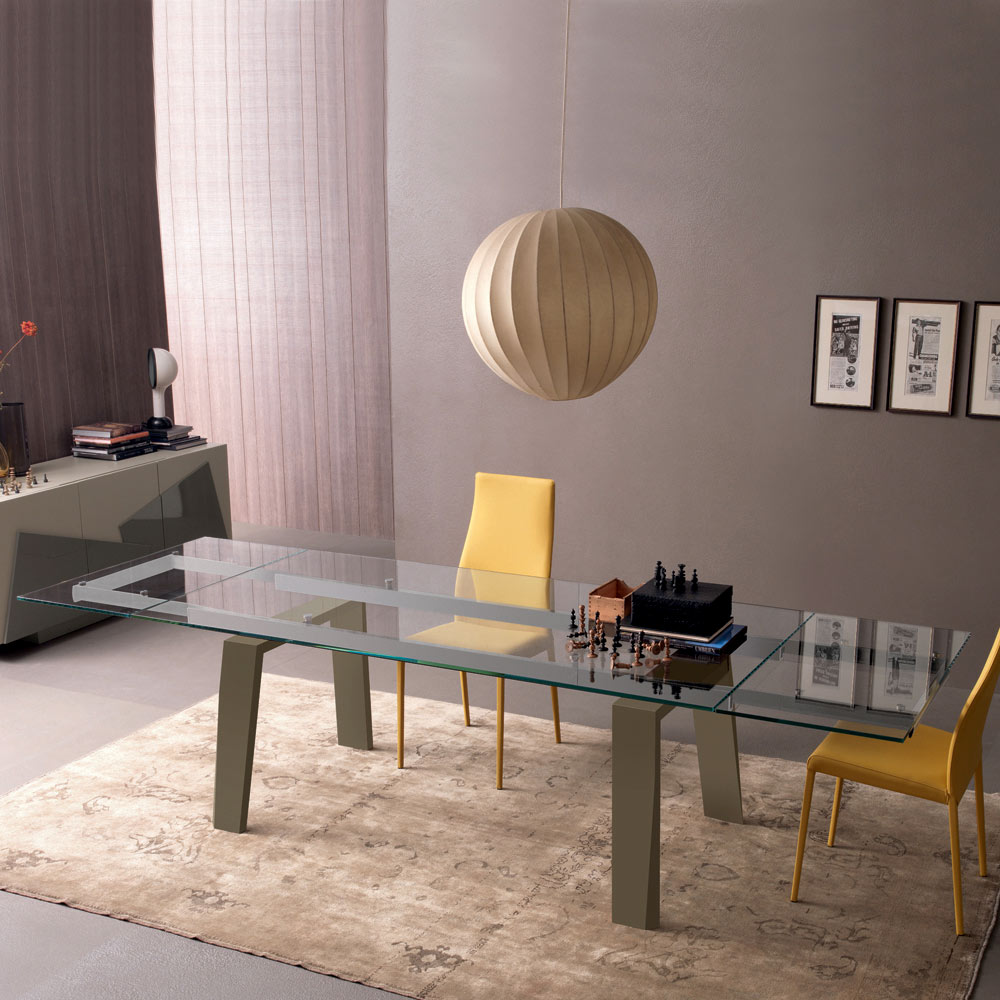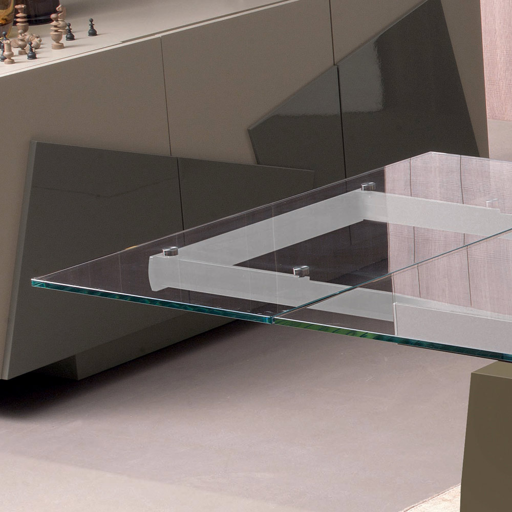 Masa de sufragerie extensibila din sticla transparenta si picioare din lemn lacuit, 2 dimensiuni fabricate in Italia.