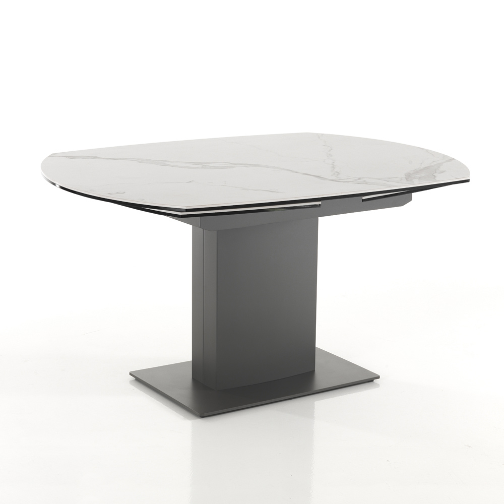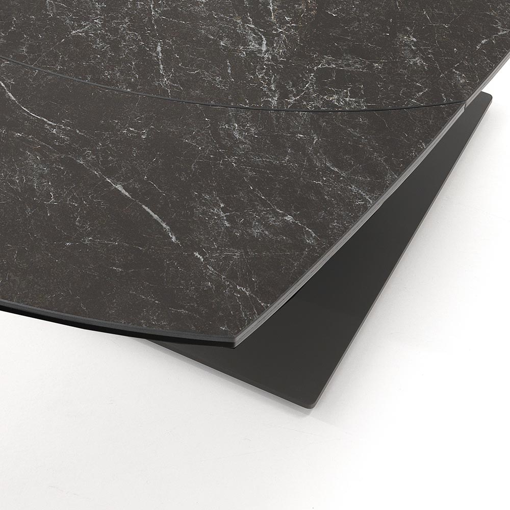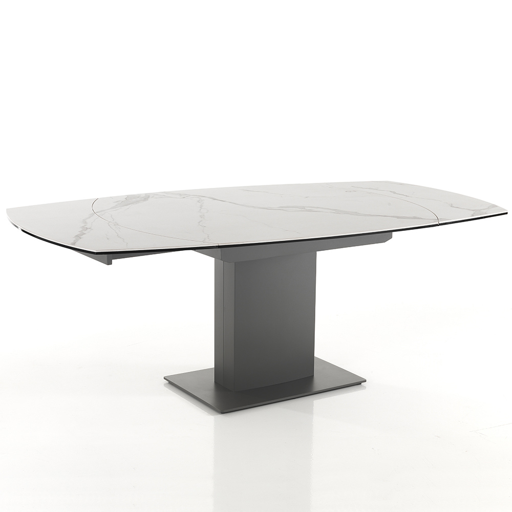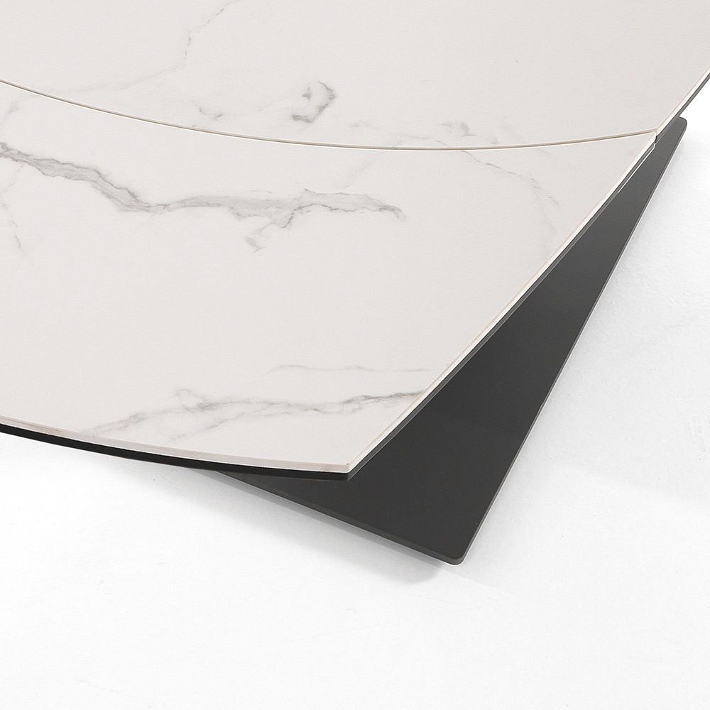 mecanism practic de pivotare, masa poate atinge o lungime maximă de 180 cm permițându-i să găzduiască un număr mai mare de invitați pentru prânzuri și cine minunate cu prietenii. Combinația perfectă dintre eleganța ceramicii și detaliul impunător al bazei din oțel creează o piesă de mobilier cu o