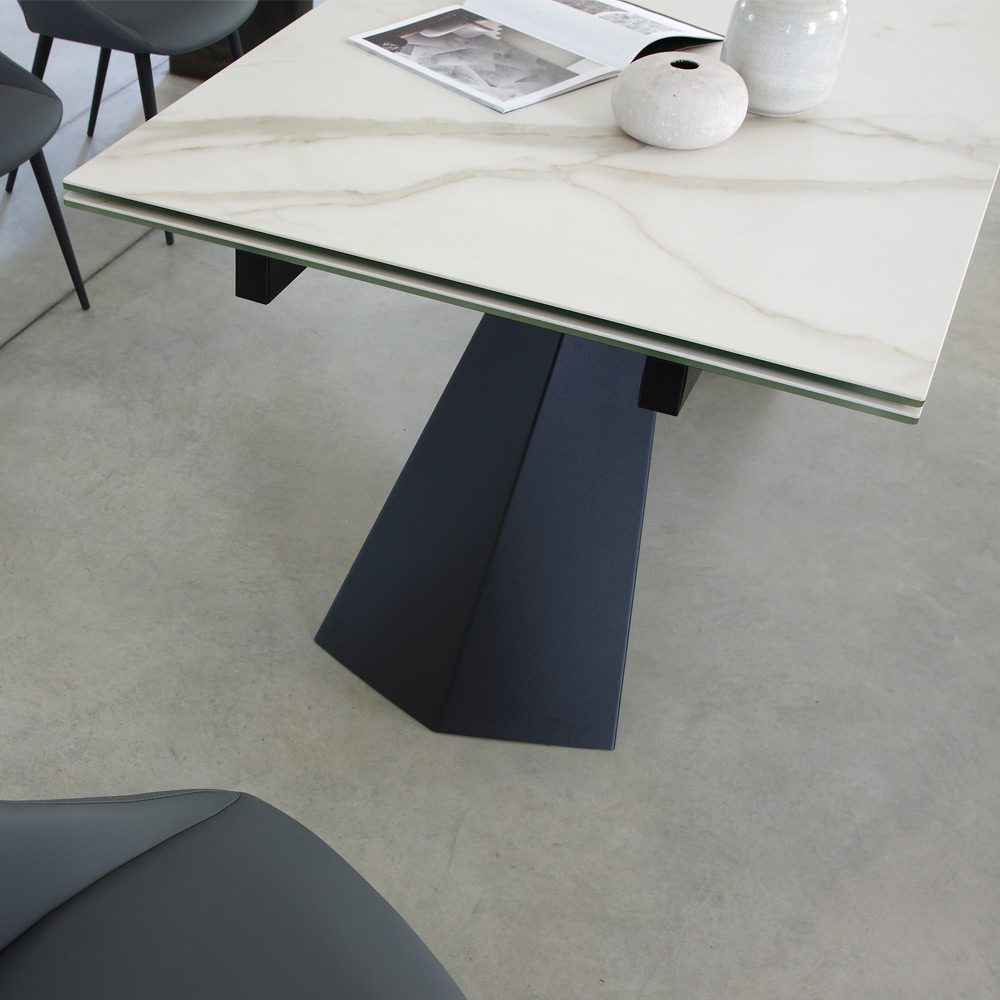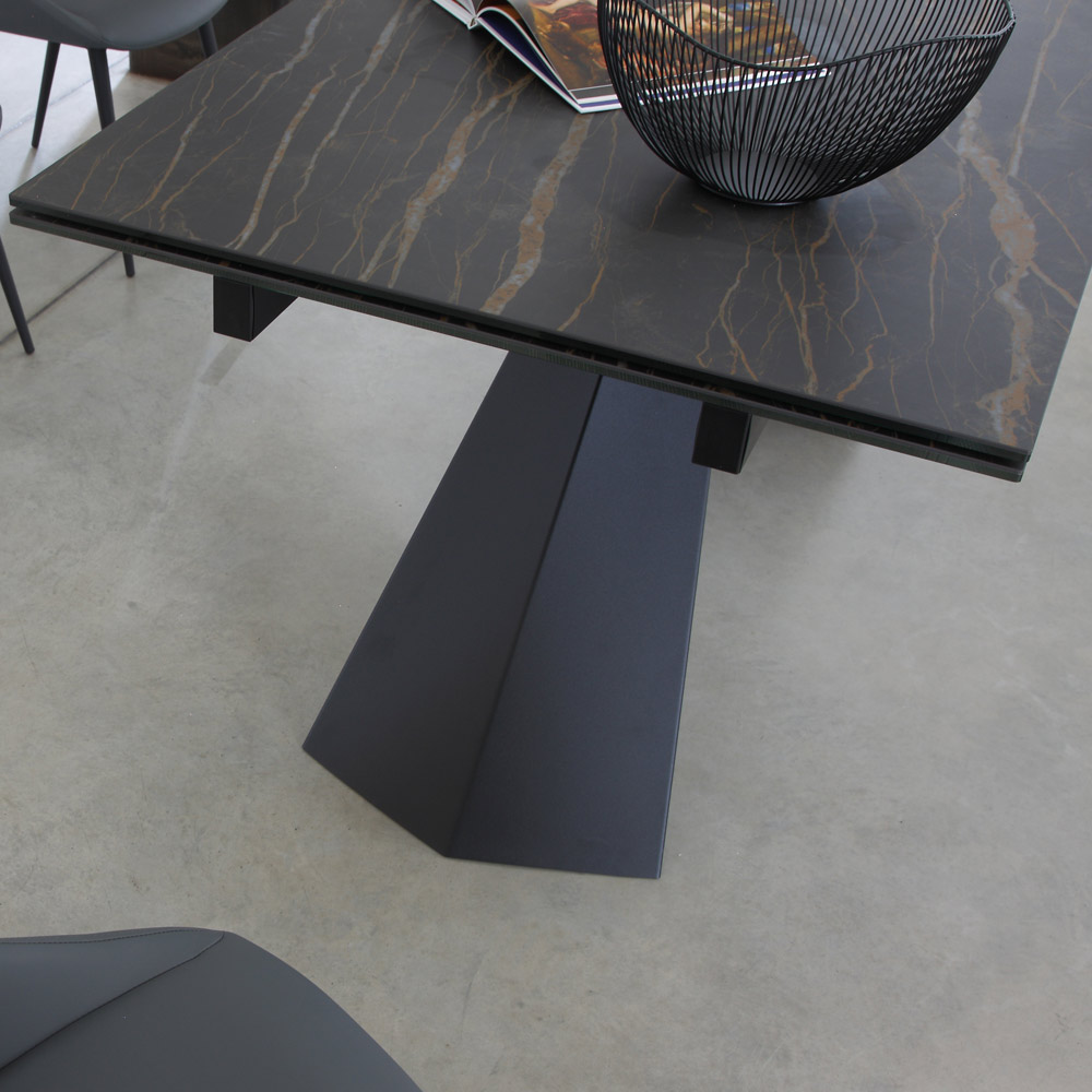 blat din sticla ceramica (grosime 5 + 6 mm). Ideala pentru cei care iubesc un stil de mobilier esential si versatil, aceasta piesa de mobilier este capabila sa completeze cu gust si eleganta ambientul sufrageriei sau bucatariei lor. Particularitatea sa constă în blatul din sticlă ceramică care este incredibil de puternic și