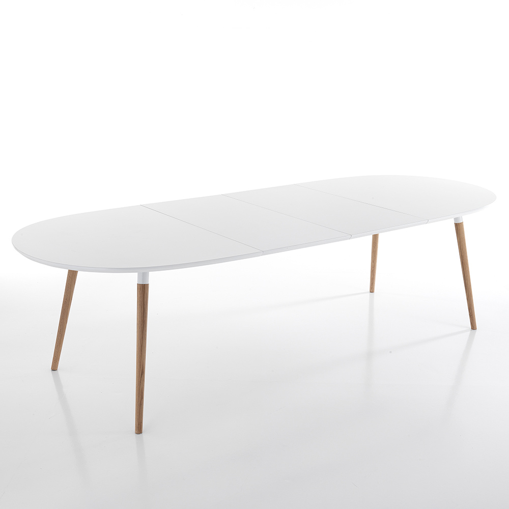 Masa de sufragerie cu blat extensibil din mdf lacuit alb mat si picioare din lemn masiv cu finisaj stejar . Un produs cu un design simplu si curat, ideal pentru cei care iubesc un stil de mobilier esential si versatil capabil sa completeze stilul sufrageriei sau bucatariei lor cu gust si personalitate. Punctul sau forte este reprezentat de blatul extensibil datorita a doua extensii de 50 cm fiecare care permit mesei sa ajunga la o lungime de 220 sau 270 cm.