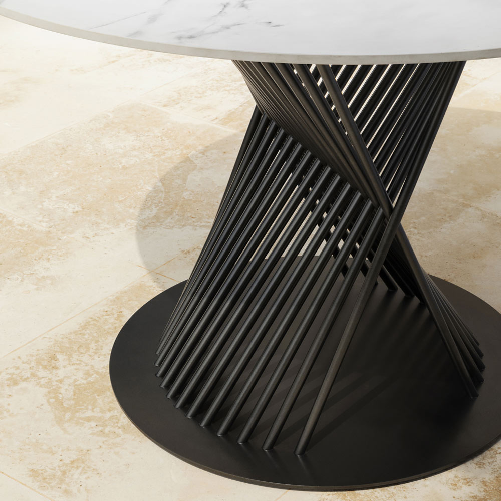 Masa de sufragerie in aer liber este realizata in Italia, compusa dintr-o structura din aluminiu turnat si un blat rotund din gresie portelanata cu efect de marmura . Baza reprezinta cel mai original detaliu conferind acestei mese un puternic caracter modern si un design rafinat si formal .