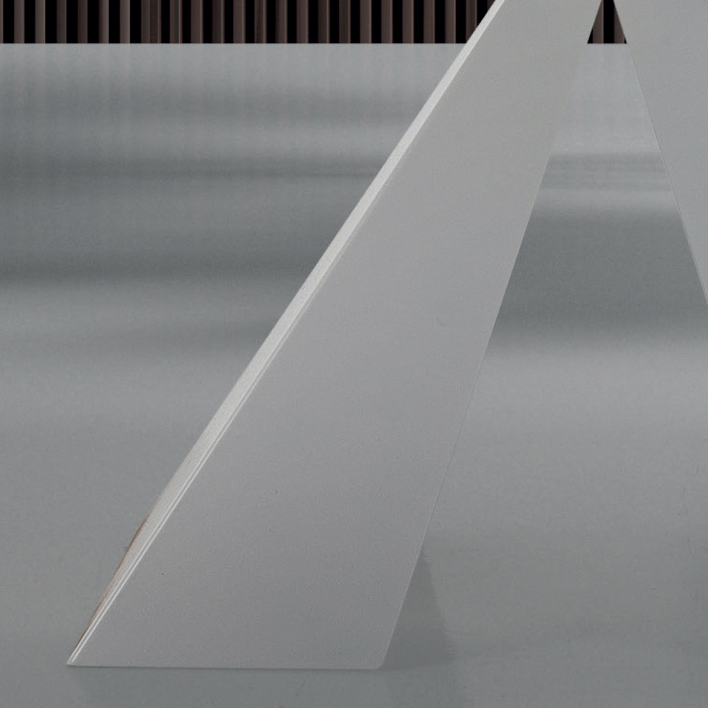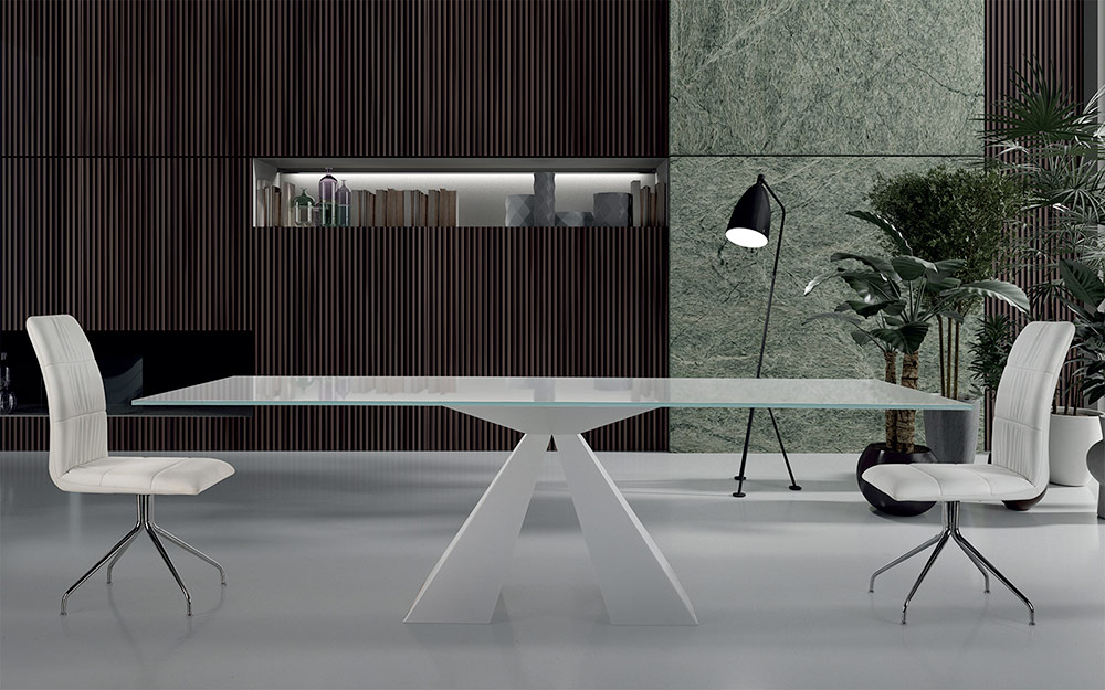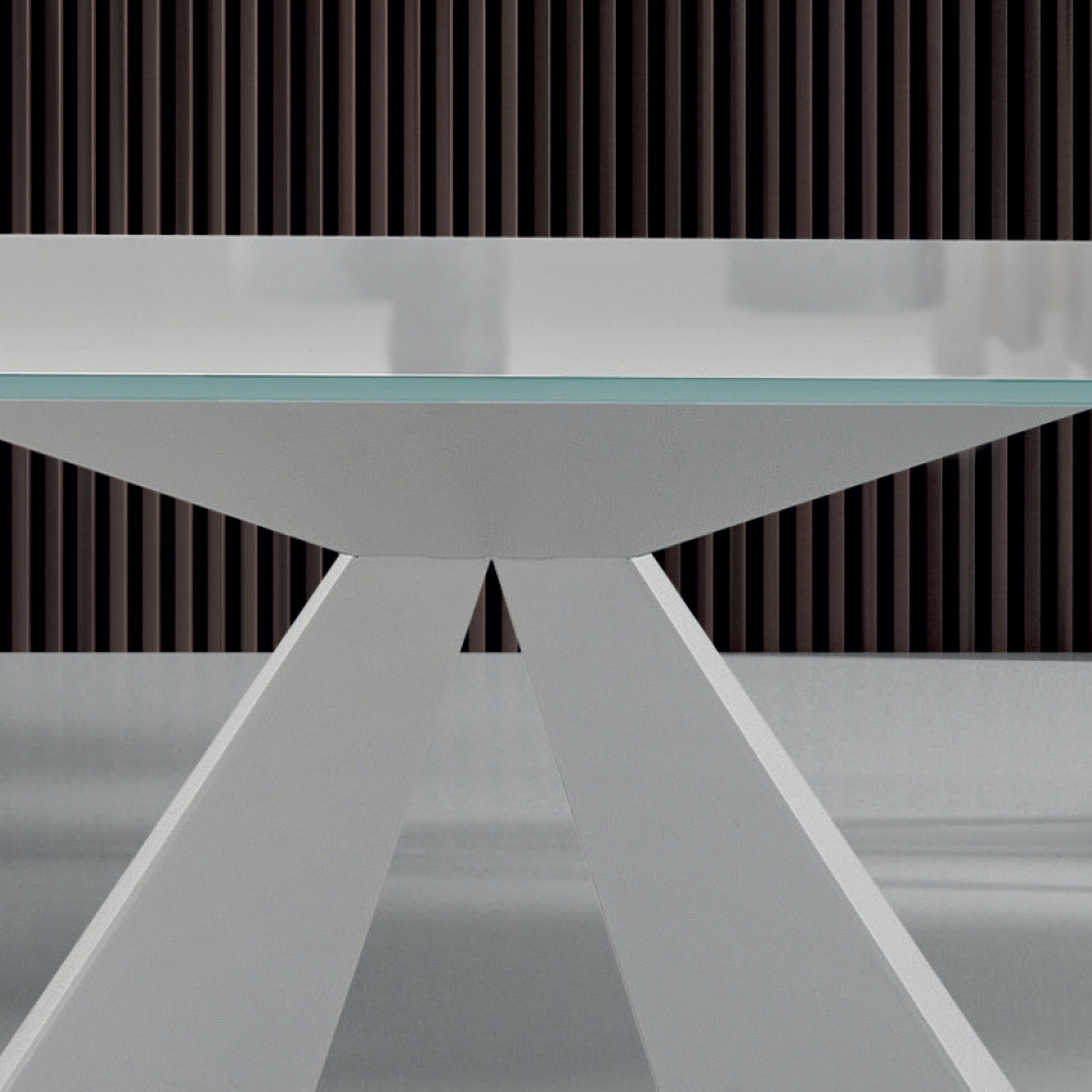 Masă dreptunghiulară modernă, realizată manual în Italia, din sticlă securizată și bază din oțel alb.