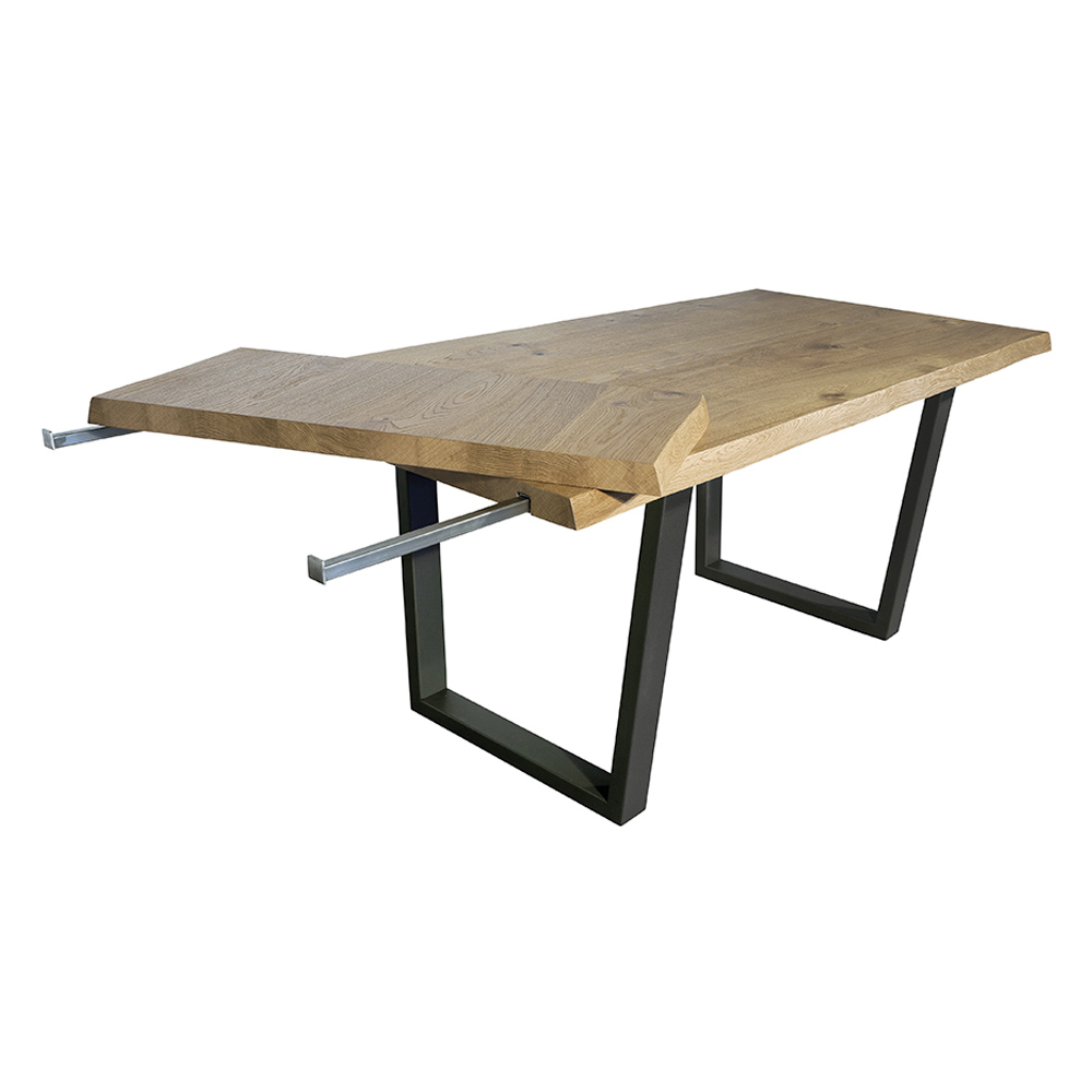 furniruit în stejar masiv înnodat de culoare scotch, iar baza sa este din metal gri fier. Această masă a fost creată cu grijă și pasiune pentru a celebra unicitatea și puterea naturii, realizată de meșteri experți italieni din sectorul