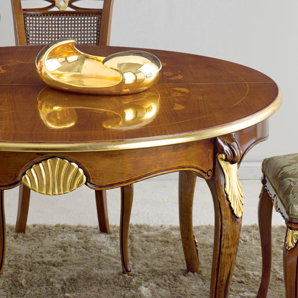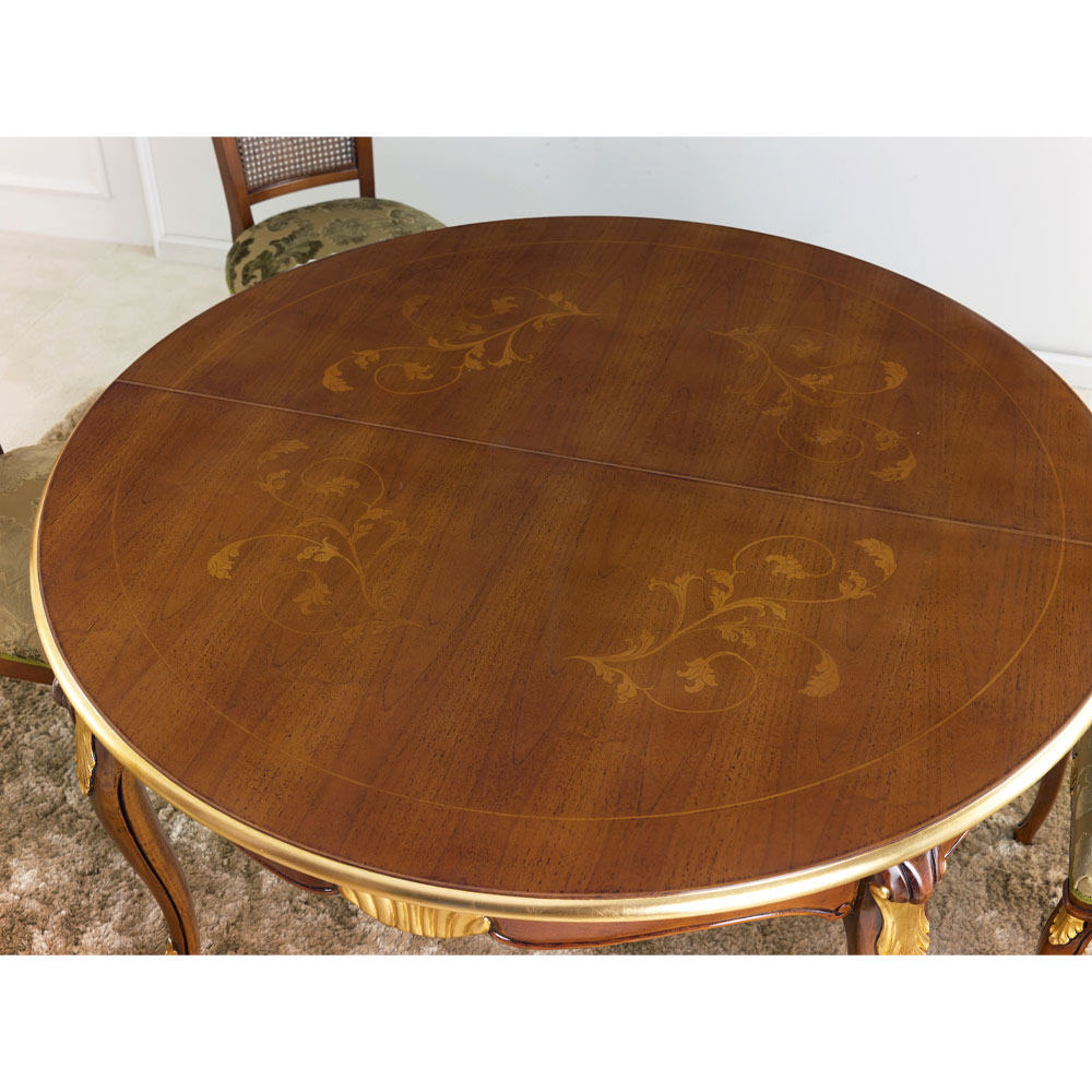 Masa de sufragerie cu blat rotund extensibil pana la 240 cm datorita a doua extensii interioare de 50 cm, realizata in intregime din lemn si disponibila in nuc Bassano si finisaje din lemn antic auriu sau alb si argintiu.