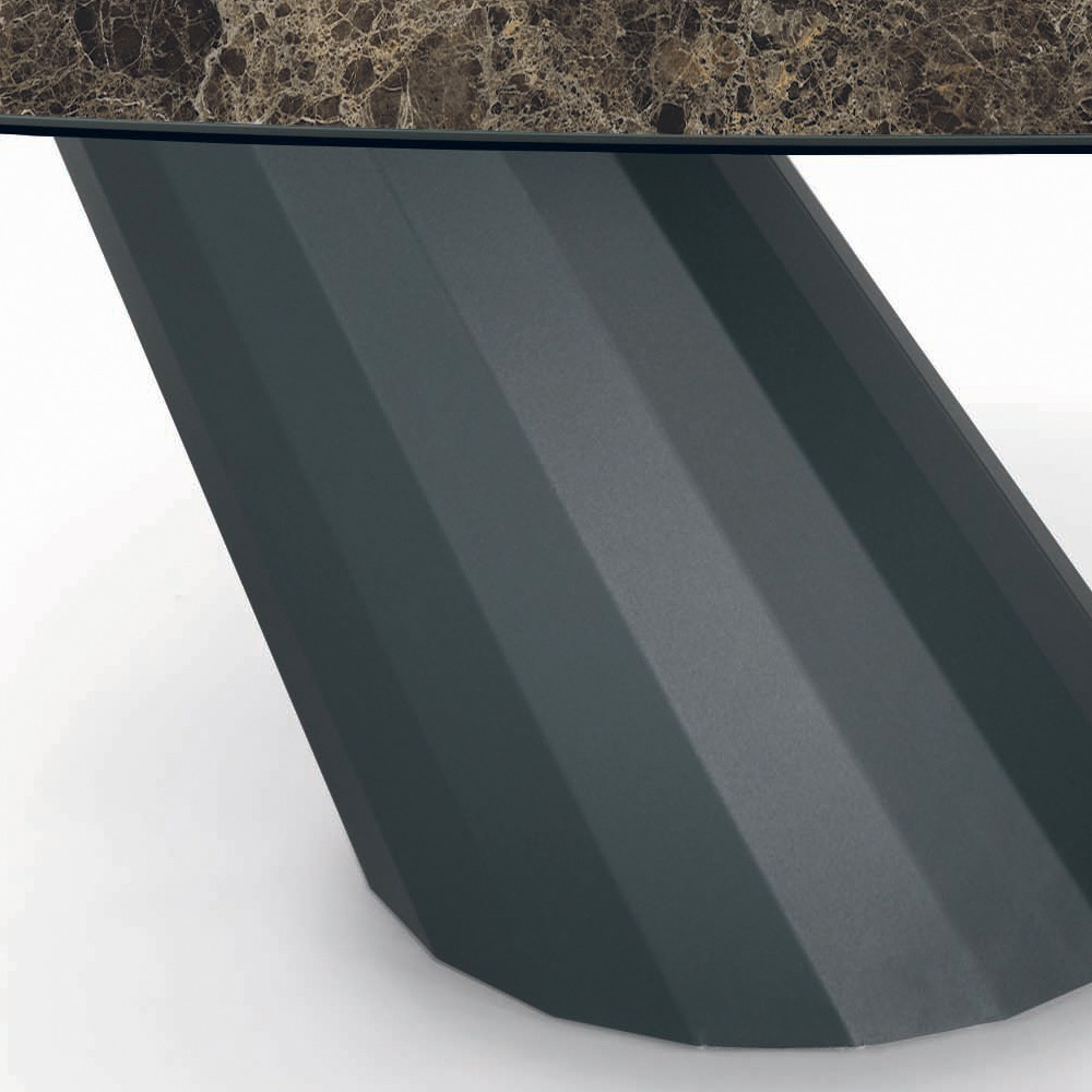 Rafinamentul formei bazei combinat cu finisajul blatului pe care îl alegeți creează o masă unică, cu un mare impact vizual, care amenajează cu