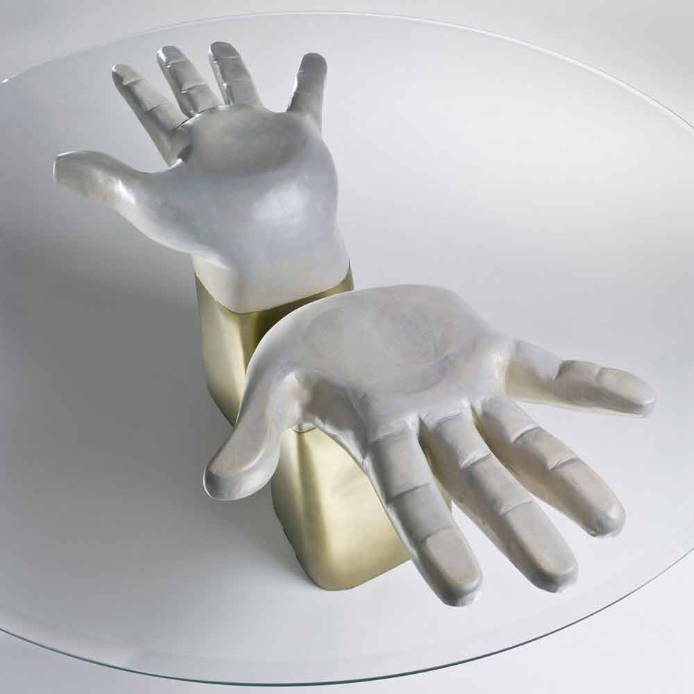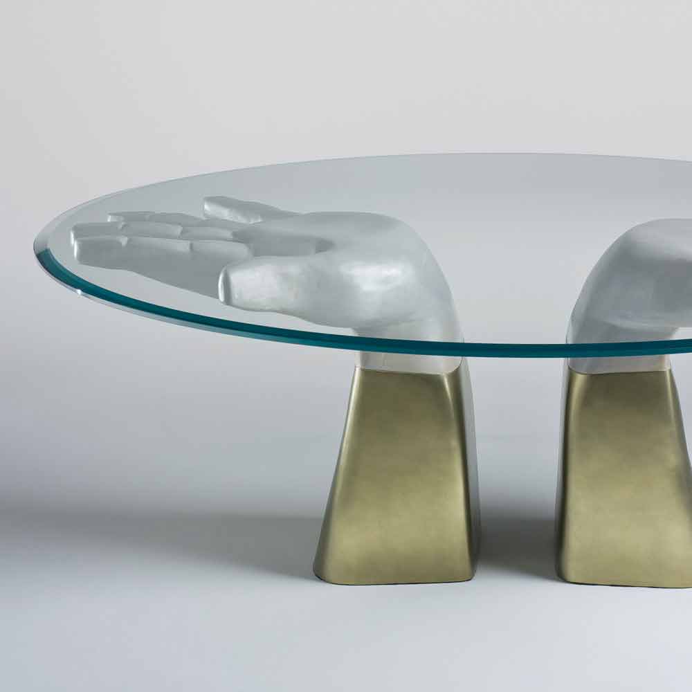 masă cu bază sculptate compus din două mâini din lemn sculptat, teșite de top de sticlă de 15 mm. Disponibil în două finisaje diferite: alege din meniul drop-down cel dorit.