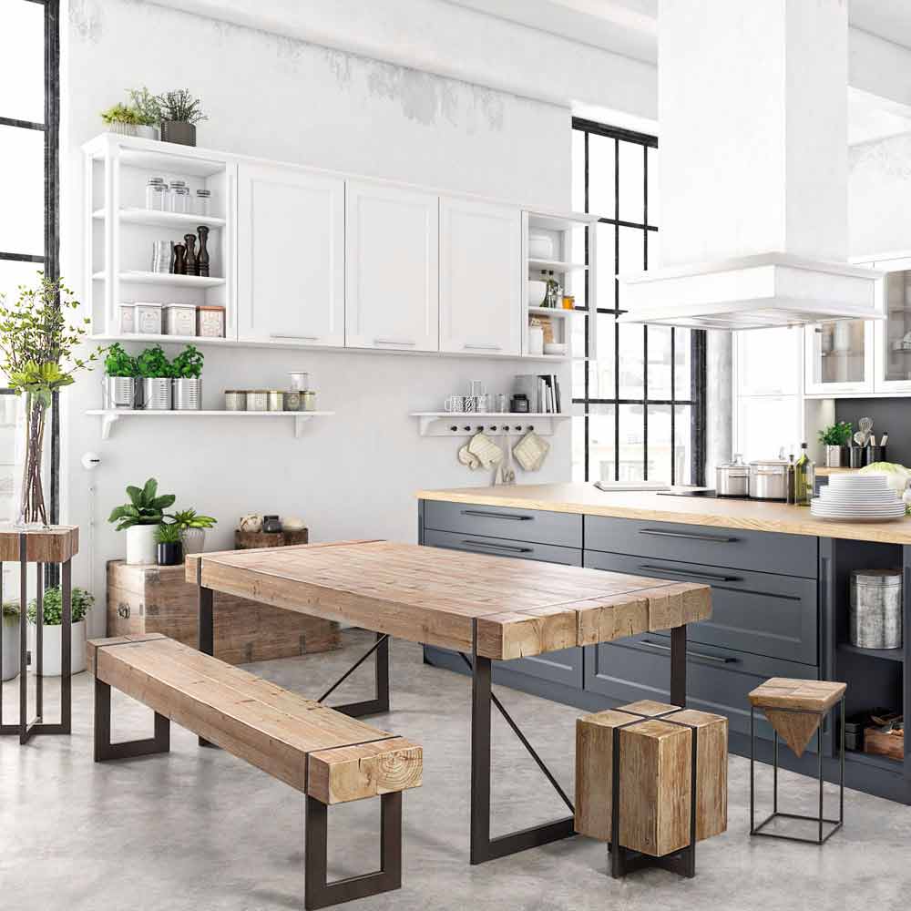 Masă modernă în stil industrial cu blat din lemn de brad.