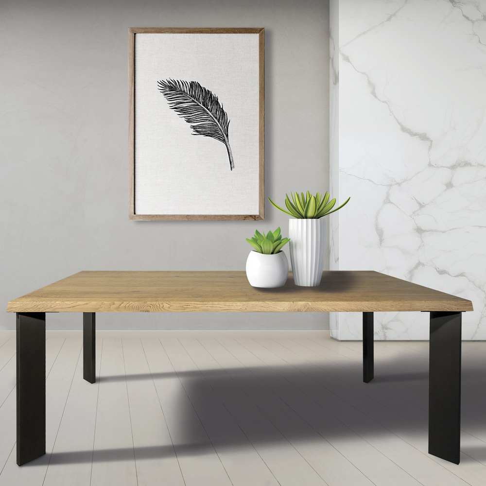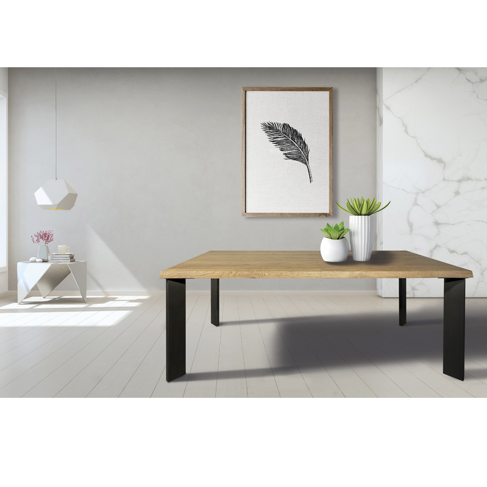 Masa din lemn placata cu furnir de stejar innodat si baza metalica Made in Italy.