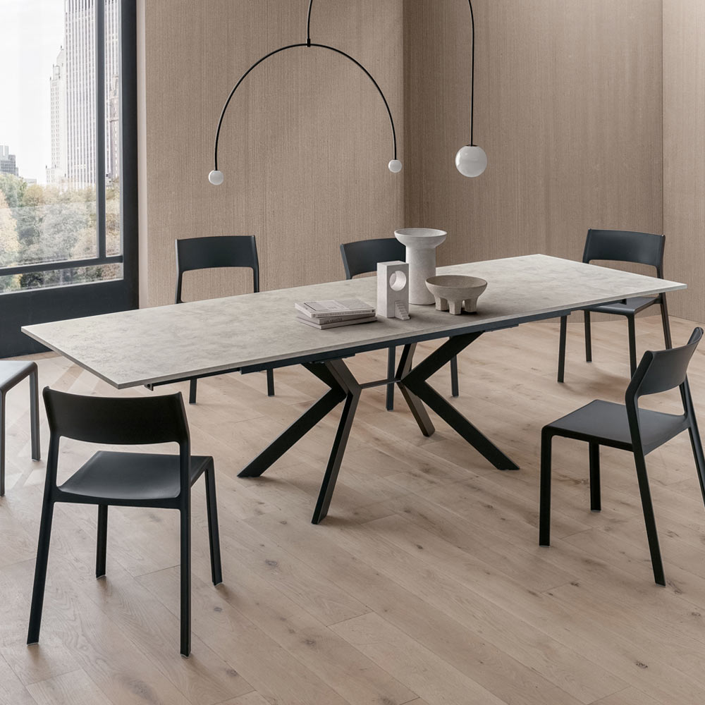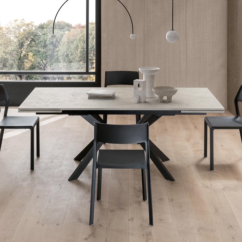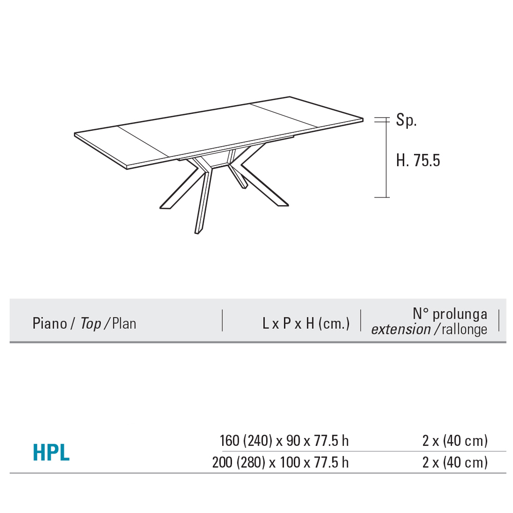 Blatul HPL cu nervuri oferă o estetică rafinată și naturală, cu o suprafață rezistentă , ideală pentru utilizarea de zi cu zi. Datorită sistemului de extensii cu extensii laterale , masa se extinde cu extremă ușurință, adaptându-se la prânzurile în familie sau serile cu prietenii.