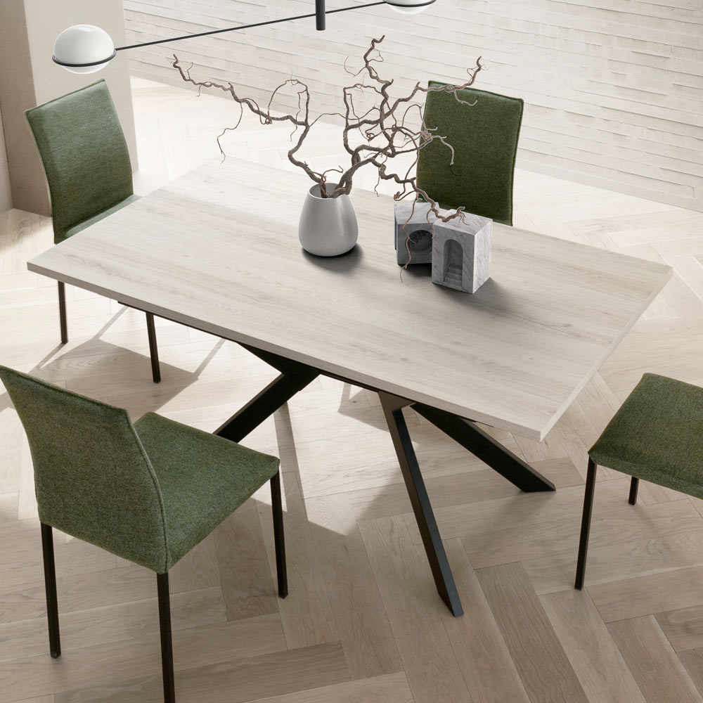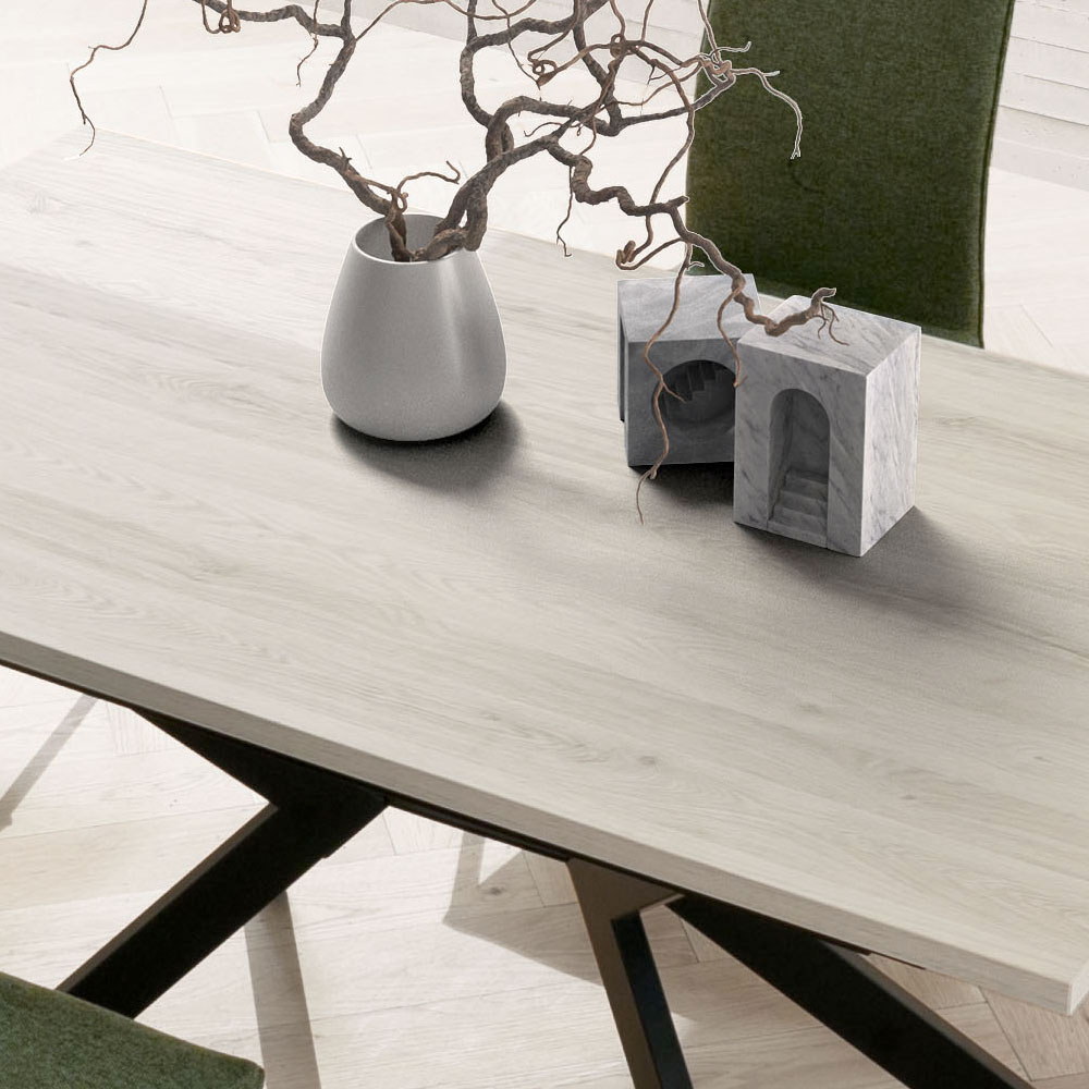 Baza, din metal vopsit și cu un design geometric încrucișat, oferă stabilitate și o notă sculpturală care nu trece neobservată. O soluție perfectă de mobilier pentru sufragerii, spații deschise sau medii contractuale cu un stil rafinat.