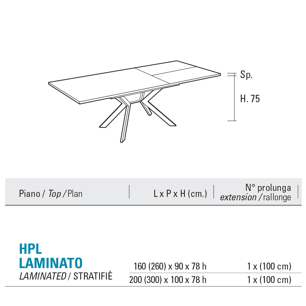 Blatul dreptunghiular din HPL oferă un aspect rafinat și material, perfect pentru mediile moderne. Suprafața este rezistentă , ideală pentru utilizarea zilnică fără a sacrifica estetica. Sistemul de extensie integrat vă permite să extindeți cu ușurință masa, făcând-o perfectă pentru a primi prieteni și familie cu orice ocazie.