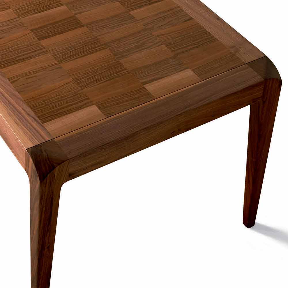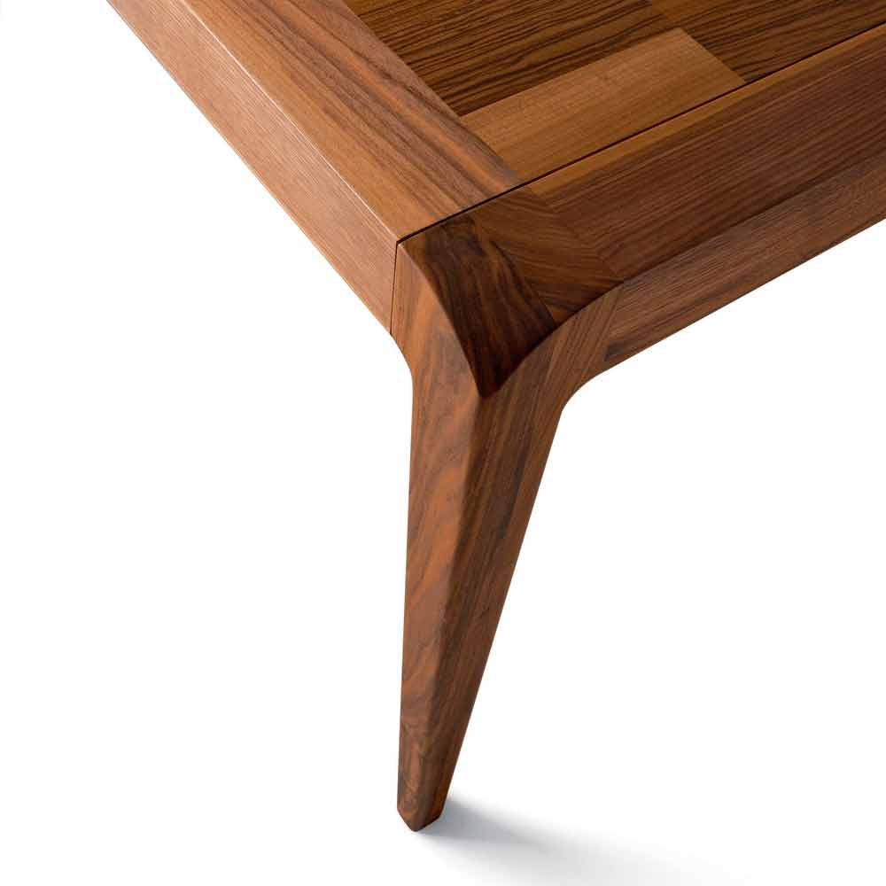 Masă extensibilă cu placa de pardoseala cu încrustații de nuc naturale. Cadru și picioare din lemn de nuc masiv. Extensii cu grupuri de substrat. Tabelul evidențiază pentru prelucrarea corectă a planului, un mozaicar contemporan care merge bine cu mișcarea curbată a picioarelor, care nu creează colțuri.