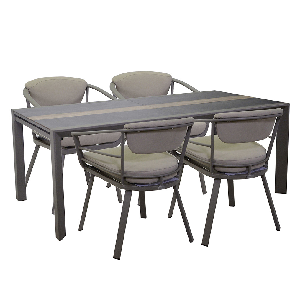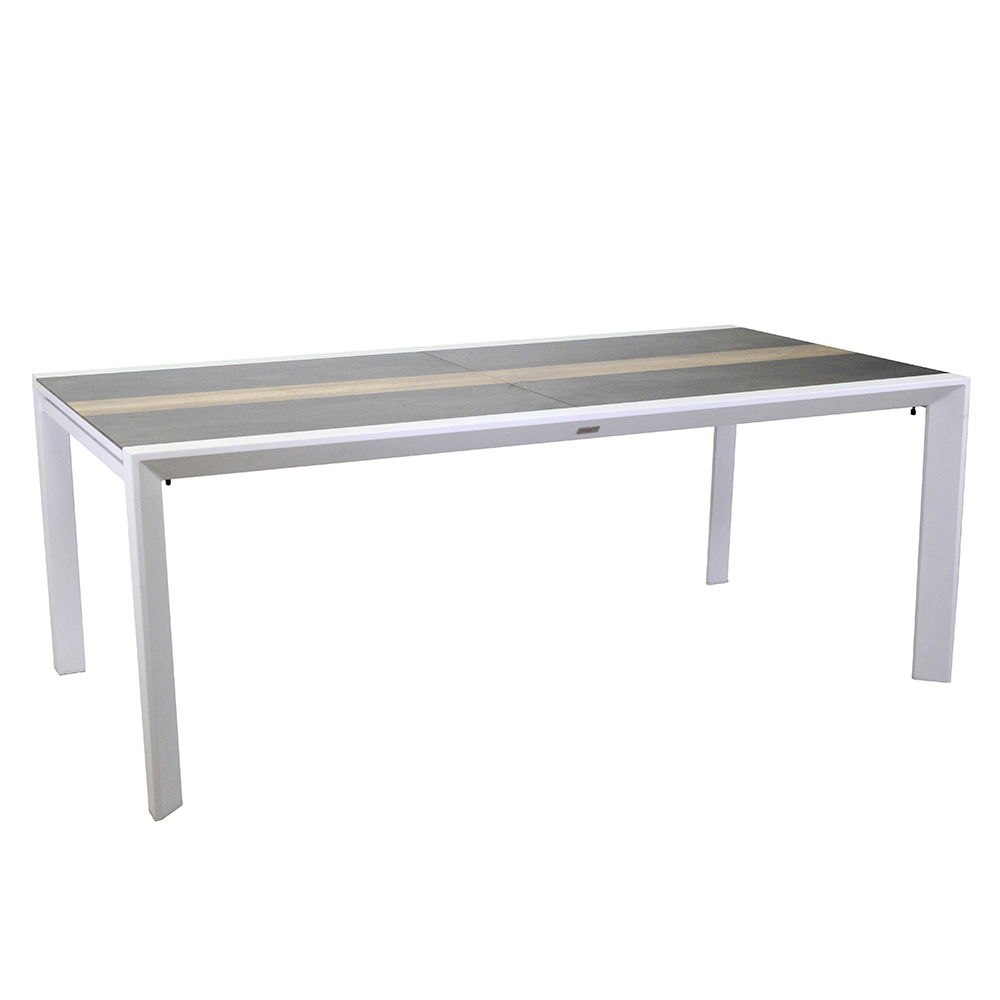 Descoperiți eleganța și funcționalitatea acestei mese cu structură din aluminiu acoperit cu pulbere , concepută pentru a adăuga o notă de stil și rezistență spațiilor dvs. de exterior. Suprafața mesei HPL (High Pressure Laminate) cu grosime de 6 mm garantează durabilitate și o estetică rafinată, finisajul său fiind format din 9 panouri de culoarea lemnului care se integrează armonios în designul modern.