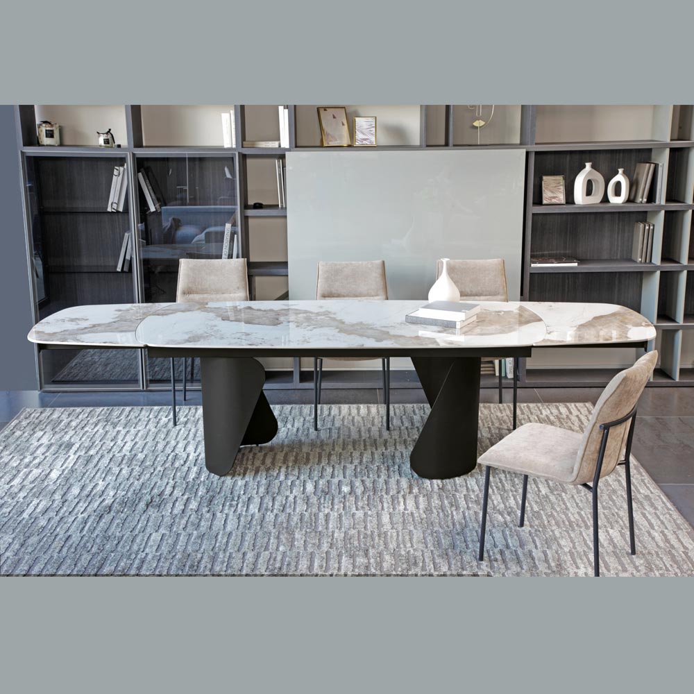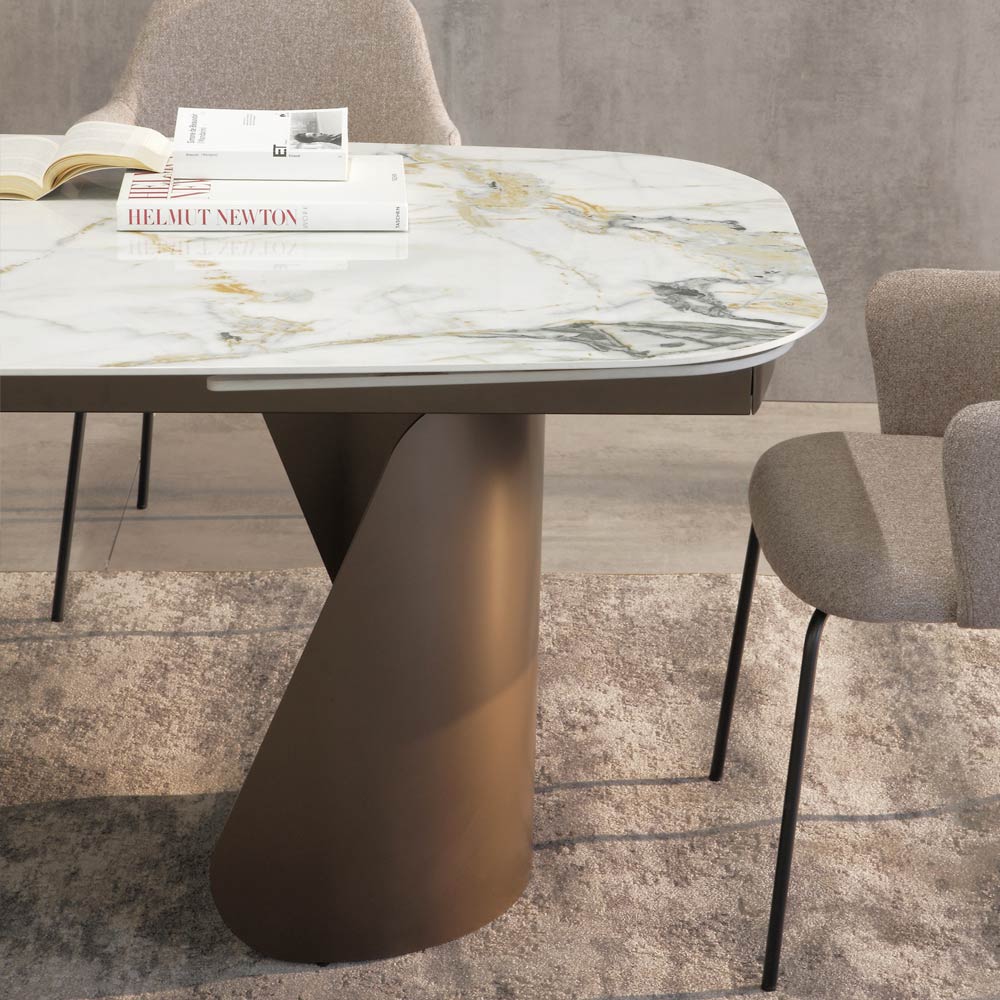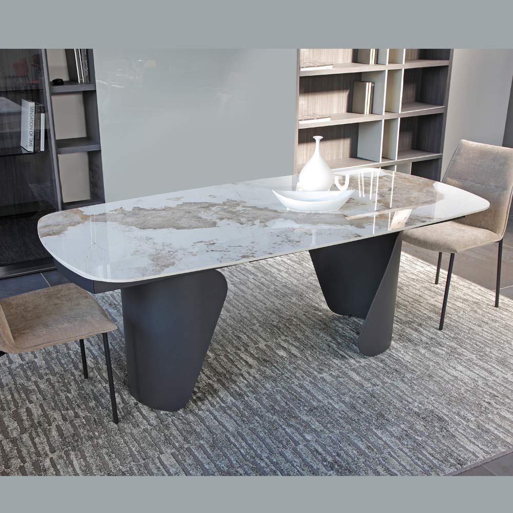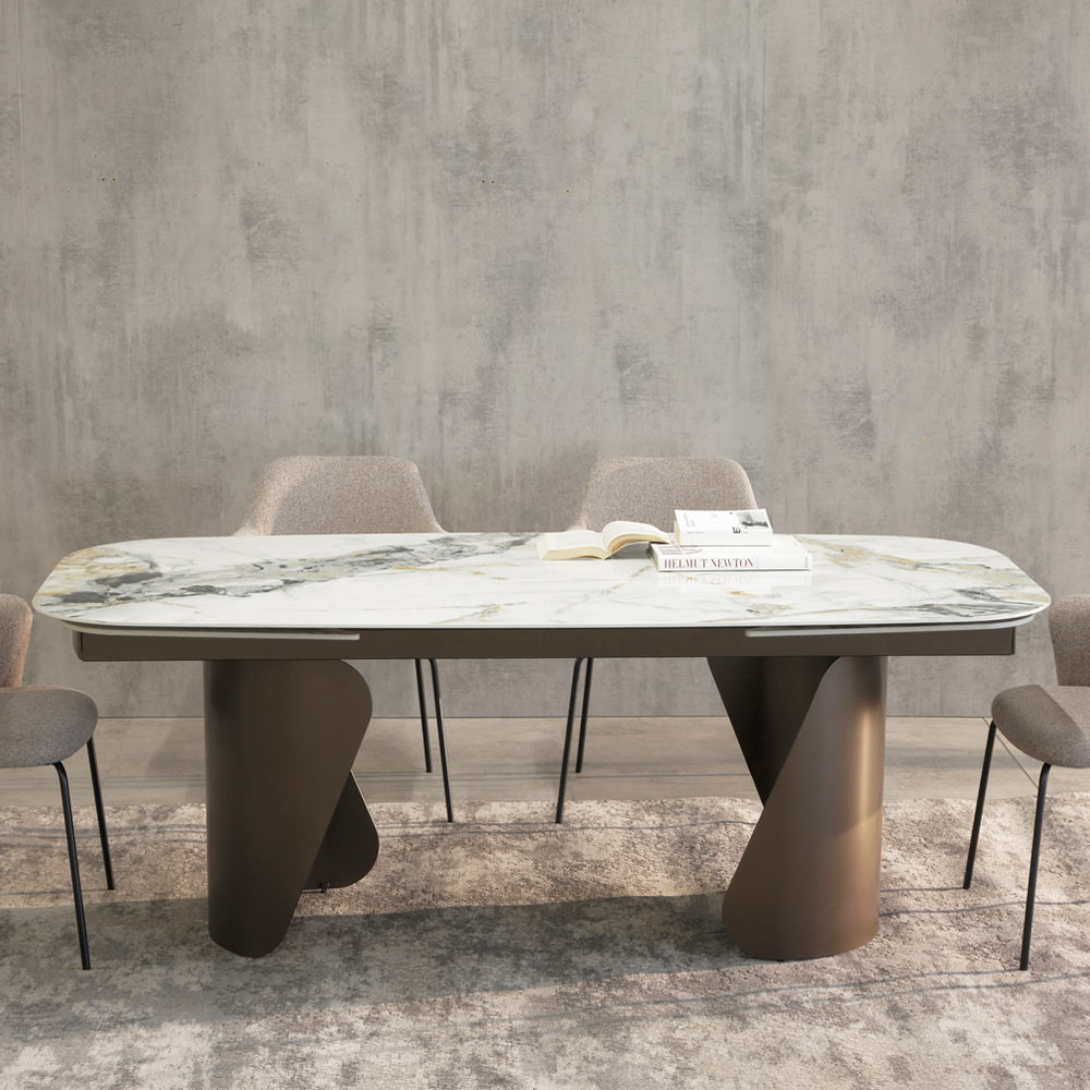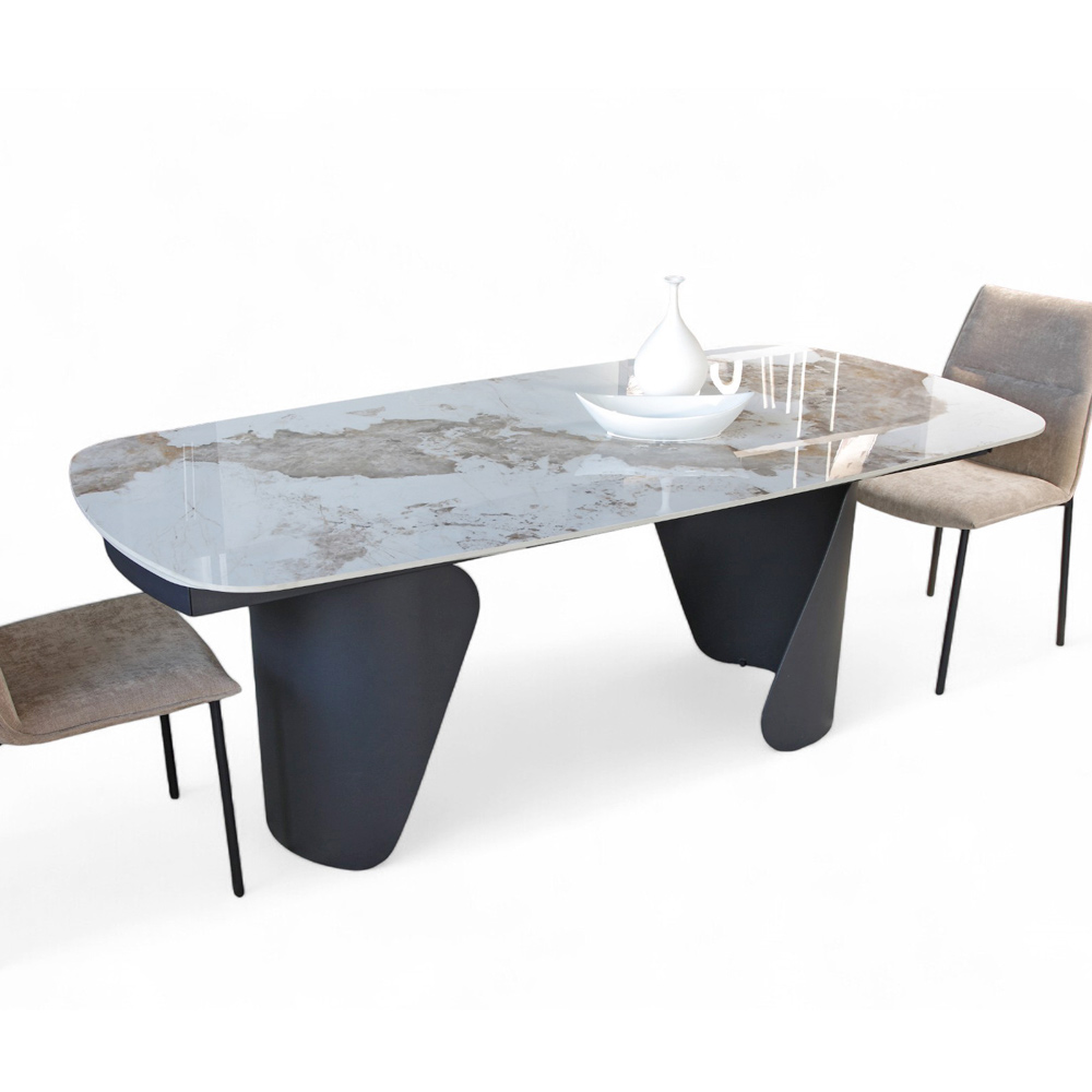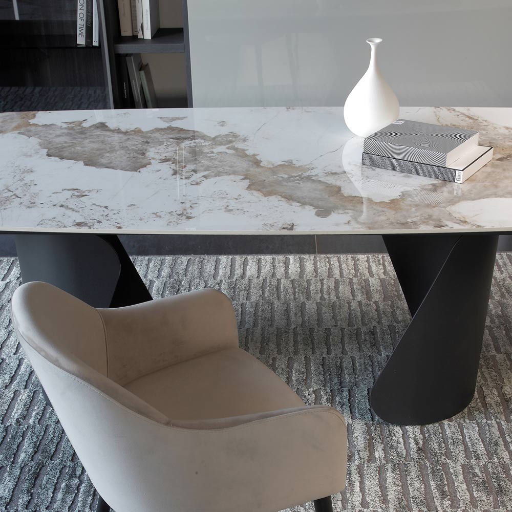 Baza sculpturală din metal vopsit conferă stabilitate și un caracter puternic mesei, creând un contrast material interesant cu suprafața. Formele geometrice asimetrice ale picioarelor adaugă o notă artistică și sofisticată designului general.