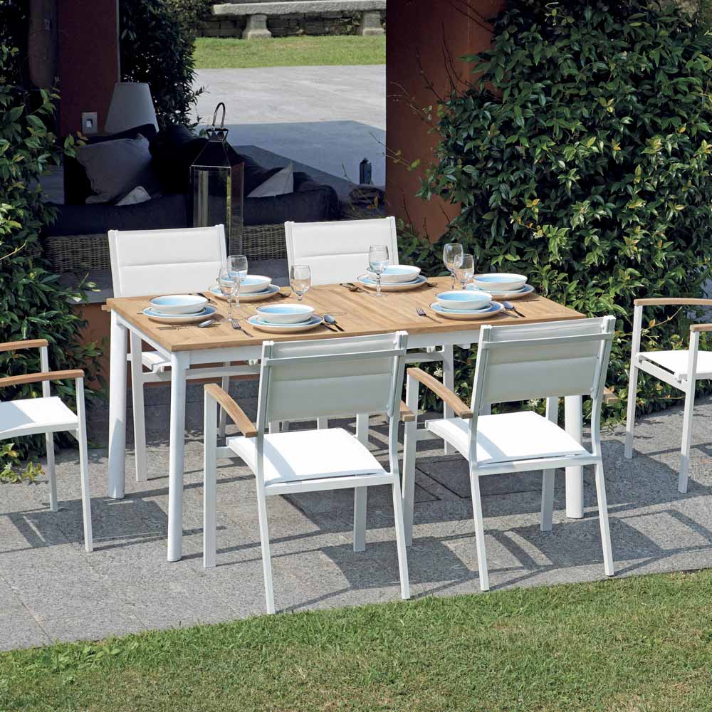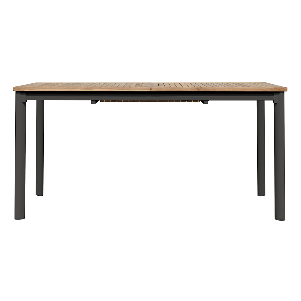 Blatul mesei este realizat din lemn de tec de înaltă calitate, cunoscut pentru durabilitatea și rezistența la intemperii. Teakul, cu tonurile sale naturale calde, adaugă o notă de căldură și rafinament spațiului tău exterior. Picioarele robuste și ușoare din aluminiu oferă o stabilitate excelentă și rezistență la coroziune, asigurând că masa își păstrează frumusețea în timp.