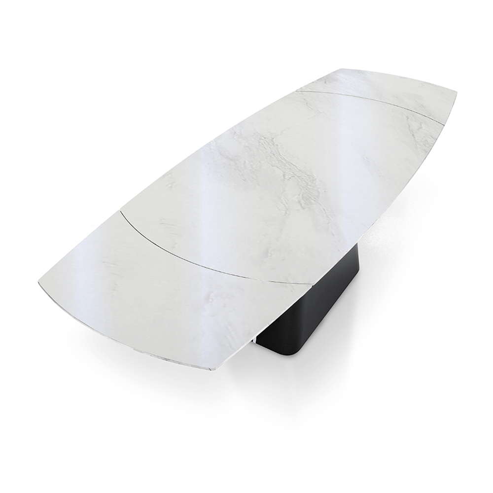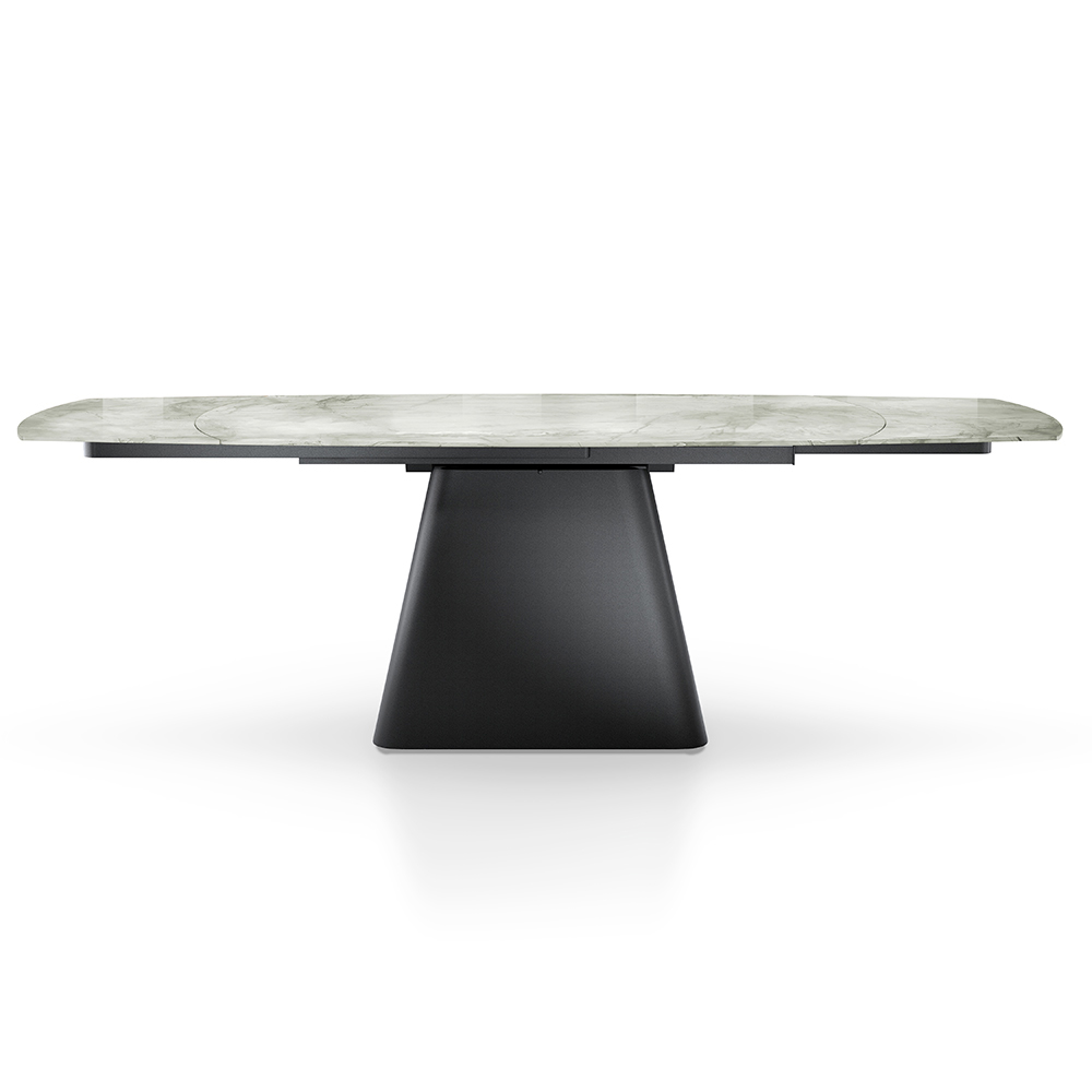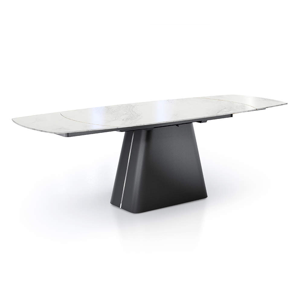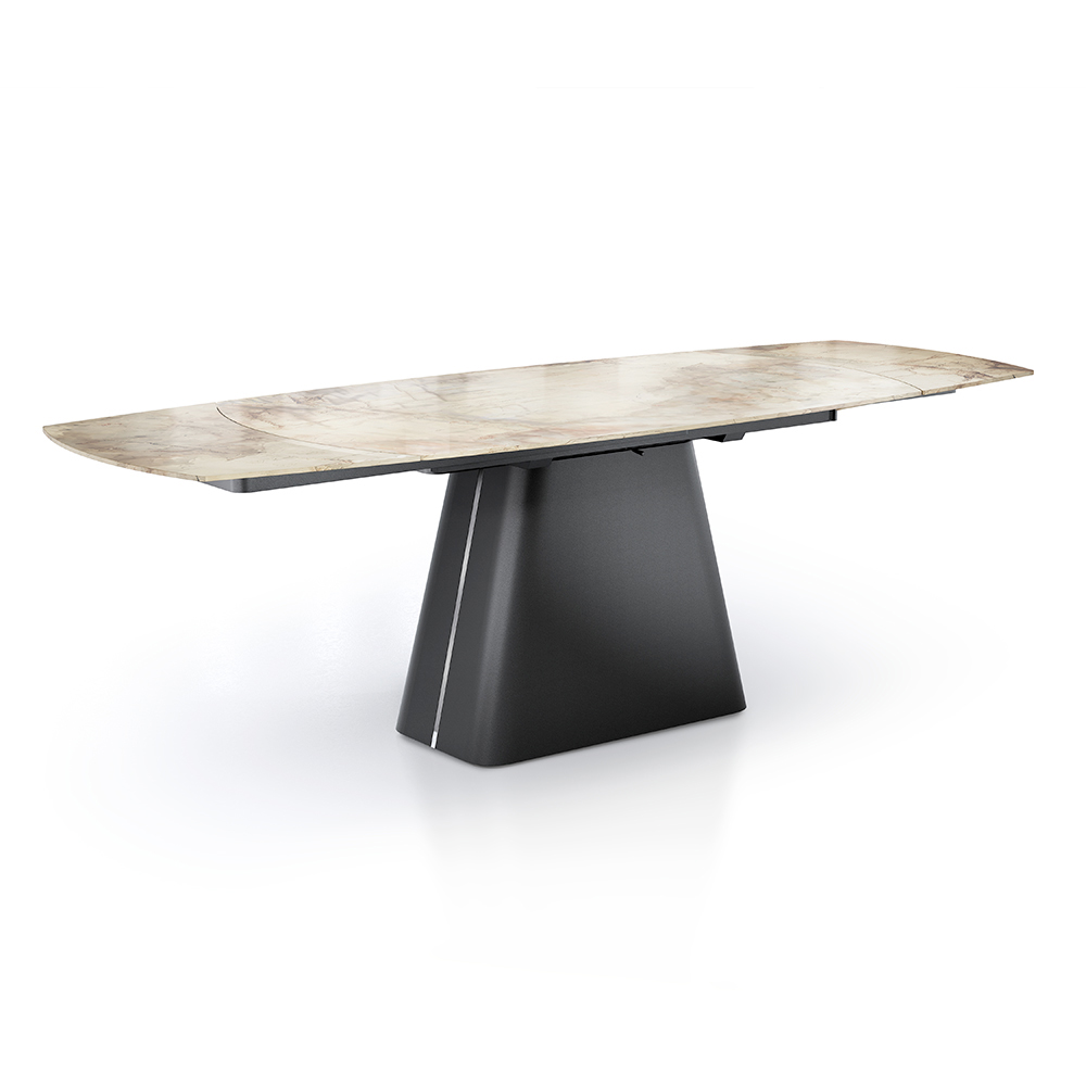 Această masă extensibilă este o capodopera de design și funcționalitate, ideală pentru cei care doresc să îmbine eleganța și versatilitatea într-o singură piesă de mobilier. Suprafața se așează pe o bază metalică neagră robustă și stilistic îndrăzneață, oferind un contrast vizual uimitor care atrage privirea în orice sufragerie.